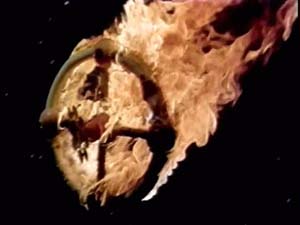 The last evacuation ship leaves the launch bay, pausing to pick up Eliot’s team. Needless to say, when Eliot learns what Rankin is up to, he immediately heads back down to lend him a hand. Meanwhile, Rankin enters an apparently deserted control room, only to have the monsters suddenly burst out from behind a wall panel. I have to admit, they may just be slime creatures, but they do have a highly developed flair for the dramatic. Rankin’s gun soon runs out of power (can’t you monitor the charge on those things?), and he repeats Eliot’s feat of chucking it and impaling one of the monsters. I suppose it’s possible that slime monsters would be porous enough for them to be easily skewered, but I am a little surprised that the clunky rifle would prove so reliably aerodynamic. Meanwhile, a now defenseless Rankin hops around the room, trying to avoid the deadly sparking tentacles. Just when it seems his goose is literally cooked, Eliot appears and provides some cover fire. The two briefly exchange some manly chatter, and then Rankin makes for the control panel. As Eliot holds the monsters off, Rankin engages the propulsion system and sets the Gamma 3 into the Earth’s atmosphere. (Unwisely, this is visualized by having the miniature model wobble around on a string.) Personally, I’d have sent it into the sun, but then I’m just a worrywart. Their task completed, they head out. However, the monsters are thick on