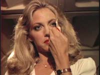forced upon the good doctor soon, eh? He goes to the check-in counter, but of course doesn’t have his ticket. He then looks back, and there is Tess the Stewardess, waving his ticket. He goes to retrieve it, and she purrs, "You know, there are other flights." C’mon, already. I’d be lying if I said I didn’t employ to some extent the fast forward button at this point in things. I must admit, by now I was pretty impatient to just move this thing on to its pre-ordained ending. So she invites him to her place, and he naturally agrees. (Russell’s revenge plot doesn’t exactly seem foolproof, but hey, when the script is on your side, amazing things can happen.) "Her place" proves to be an empty, open and completely unsecured passenger plane (!!!!!), so I guess airport security used to be really bad. He begins unbuttoning her blouse, as we go for a rare Hitchhiker three-fer. Not to beat a dead horse, but it seems to me a pretty inept plastic surgeon who can’t recognize a formally male chest molded into a female one (especially when it’s the chest of a former patient of his), but again, let’s just go with the flow and see the end of it all. Actually, actress Sonja Smits (much to the frustration of the show’s fans, no doubt) is spared baring her talents. Instead, she keeps him from touching her face, and pushes him down in a seat. "Your face," he whispers. "You’re beautiful." Really, could even the most half-assed viewer have not seen where this is going? "It’s the makeup," she replies.