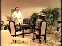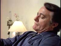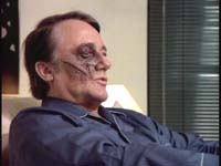 Cut to Hamilton, sitting in profile to the camera. (Gee, where is this going?) He face looks fine. He is repeating his "flesh is an illusion" spiel, and the camera pans around to the other side of his face, and IT’S ALL MESSED UP! AIIIEEE!!!! The camera zooms in on the damage, so that we can see it’s not an entirely convincing makeup job. We then cut outside, where awaits…The Hitchhiker! The Hitchhiker Wraps Things Up: "Dr. Hamilton took an oath to heal