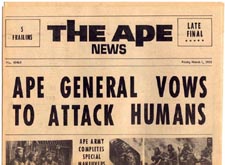 In any event, while the reader may find these digressions from the subject in main, that being metaphysics, tedious, they are nevertheless integral. For the foregoing insights into the civilization of the Saucer Men provided the first intuitive sparks which were ultimately to ignite the white-hot lantern of intellect, my own of course, which would burn off the (rather thick) fog of sleepy-headed-ness and illume the metaphysical panorama of the night’s proceedings. The reader will shortly be invited to countenance that intellectual illumination. However, good prudence toward my likely audience dictates alighting that beacon only gradually, as to enkindle it instantaneously would like to be suddenly fixing a large industrial spotlight upon a newt long accustomed to dark cave-dwelling; the newt would quickly lose its wits and go demented from the glare, and be consigned to living out the remainder of its days in a mad-house (or possibly a terrarium stocked with albino crickets). Therefore, I shall lead the reader upon the same gradual path which I followed to my own abstract realization, just as Virgil led his ward to the brink of the angelic lattice-work of the celestial vaults. And so, along the way to that Elysium, we must first pause Beneath the Planet of the Apes. We all know the story from Planet of the Apes; bungling interstellar travelers from Earth somehow manage to wreck their spacecraft against the surface of a desolate planet, inundate their ship with pond water, at last sending inestimable billions of dollars of aerospace hardware to an ignominious and watery tomb. They thus unwisely bargain their spaceship for an inflatable water-vessel, and slip discretely away from the scene of their costly ineptitude. Nor is this the end of their self-imposed travails; almost immediately upon learning that the planet is inhabited by semi-intelligent apes who have made no further technological advance than wooden carts and horse-borne conveyance, the explorers fall into captivity by these simian creatures. The audience discovers that these apes have constructed crude stone cities, and that they hold dominion over human-beings, who are mere savages on this world, and even less couth than the ape-men. In the end, only one of the explorers survives the captivity, namely Charlton Heston, but only after having become romantically involved with a savage-woman whom he courts during confinement. In the final scene, Mr. Heston rides along a sea-coast of this ape-planet by horse along with his savage-woman, and discovers that the apes had somehow crafted a statue that looks almost exactly like the Statute of Liberty; for some inexplicable reason, he becomes very agitated, and the film simply ends; this really seemed to go nowhere for me. In the sequel, Beneath the Planet of the Apes, another spacecraft is fed into the voracious maw of incompetence to determine the whereabouts of Charlton Heston and his erstwhile crew, unaware that the ship being sought after was now being piloted by fish. Of course, the ‘rescue’ craft pulls an Oswald Boelke and proceeds to crash into the same planet with sufficient force to kill all but one of its complement. One is led to conclude from all of this that future aerospace programs will do away with such unmanly contrivances as flight and landing simulators, with pilots trusting their interstellar steeds rather to the daring ‘spit and windage’ techniques which spirited the barnstormers of the early days of flight.