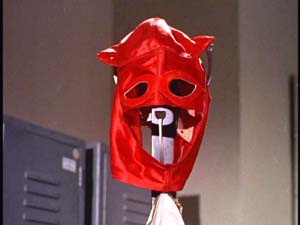Given my prediction just a few paragraphs back, regarding the probable appearance of wrestling scenes, I must admit that I laughed when the first shot of the film proper centers upon a bright red wrestling mask hanging on a coat rack. Well, that answers that question. This item is soon plucked from its perch by Lucy, a lady in a matching red leotard, which had me wondering if a) This film is part of Cardona’s earlier "Wrestling