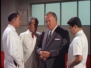 Back at the hospital, Arthur and a guilt-stricken Lucy watch as Elena is wheeled into surgery. (Nobody else is around, so I guess Green Wrestler doesn’t have a manager or attendant, much less a boyfriend.) "But I feel I am to blame!" Lucy quickly avers. I wondered what that ‘but’ signifies, since that’s the first thing either of them says. "Why are you to blame?" Arthur retorts, which doesn’t exactly burnish his detective credentials, if you ask me. His point, though, is that wrestling is a dangerous business, etc. At this point a doctor appears and explains that Elena will need surgery, and orders a nurse to call Dr. Krallman. Here we cut to Krallman in his Obligatory Mad Scientist’s Lab™, with comes complete with all the staples: gorilla cage, oscilloscope, tabletop array of Circular Flasks containing Mysteriously Color Fluids, etc. The phone rings, whereupon Krallman is interrupted from (what else?) peering into a microscope. Learning that he is needed, he prepares to leave for the hospital. First, however, he checks in on the bedridden Julio, his fully grown but wan-looking son. Krallman exhibits several Significant Looks of Concern as he does so. Cut to the hospital just following Elena’s operation. (Uhm, do doctors usually emerge from hours of internal surgery sporting spotless white surgical gowns?) Lucy runs over to Krallman for news. "We’ve done everything that is indicated," he muses. "Now all we can do is wait…and pray." Wow, there’s an original line.