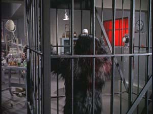 crowd, though. As you’d expect, after the mandatory pile drivers and half-nelsons, Lucy manages to overcome her opponent. Things end when she tosses her opponent out of the ring. Green Wrestler lands prostate, and right at Arthur’s feet. (Normally I’d roll my eyes at this bit of coincidence, but given the size of the ‘crowd’ here, the odds weren’t all that much against it.) The wrestler remains still. Given the shrill music chords, we are unsurprised when Arthur examines her and pronounces the woman badly injured. Lucy, looking on nervously from the ring, gasps in horror at this news. She knows the other wrestler, whose name is Elena, personally. Here we also learn that Arthur is a police Lieutenant, which is pretty much par for the course in these things. A doctor—we can tell from his prop medical bag—arrives and calls for an ambulance. Cut to (really) "General Hospital," which name is uttered by a switchboard operator occupying a markedly bare set. Behind her, an actor playing one Dr. Krallman steps awkwardly into frame. His hitching stride readily telegraphs to the practiced eye that he had been standing in place just off-camera and waiting for his cue to enter shot. The operator turns and informs Krallman that he’s scheduled to attend a meeting the next day, "up in the conference room." That sort of dense medical jargon can really help sell the setting in a movie like this. Since there’s no apparent reason for Krallman to be introduced at this point, I assumed he would prove to be our villain. This is confirmed when Krallman steps outside to his ugly, lime green station wagon, which is chauffeured by a swarthy fellow who calls him "Master." (!!) They take off just as an ambulance departs for the wrestling arena. Krallman and his henchman, Goyo, soon arrive outside a gated area. The time elements are a little suspect at this point. When Krallman left the hospital, it was clearly night time; evening time, most likely, given the wrestling match. Here, however, it looks like it’s approaching sun-up, which would seem to make it unlikely that Krallman be making that aforementioned 9:00 a.m. meeting in the Conference Room. Of course, the real answer is that it’s presumably not supposed to be anywhere near dawn, and that the apparent brightness is instead the result of inept day-for-night shooting. Goyo, for his part, exhibits a pronounced limp as he leaves the car. (I prefer my henchmen to be actual, full-fledged hunchbacks; but then, I’m a traditionalist.) He unfastens the chain securing the gate door, and they proceed into what appears to be a zoo. And, yep, there’s a stock shot of an orangutan. Here another blare of sinister music sounds over footage of the beast contentedly sucking on a plantain, which admittedly I found pretty amusing. Dodging a *cough, cough* ‘night’ watchman, the skulkers pop