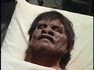 Goyo, hearing Gorilla Julio’s growls, manages to tear himself away from the microscope. (Man, they must have a cheesecake photo of Halle Berry or something on that slide.) "Master, look!" he cries, and Krallman awakens. Needless to say, he also is rather startled by the result of his tinkering. He reaches for his altered son but is shoved aside. In case you’re wondering, Gorilla Julio has luckily been provided with a pair of Hulk Expando Pajama Pants™, which thus continue to fit nicely at the waist despite the lad’s now substantially huger bulk. Gorilla Julio—safely off camera—smashes through the aforementioned doesn’t-make-sense outside window and presumably makes his way to freedom. Krallman calls for the trank rifle, orders Goyo to bring around his car, and sets out after his boy. Meanwhile, Gorilla Julio is skulking around the (needless to say darkened and unoccupied) city streets. Spotting a woman roaming around her secluded apartment, and being now a Rampaging Gorilla Man, he immediately sets forward to get her. Instead of taking the stairs, he climbs up the side of the building. You know, the Gorilla Man thing. He then interrupts her just as she’s (surprise) taking her shower, and not wanting to tax the local censors, she thoughtfully wraps a towel around herself while screaming at his appearance. We still get a bit of a butt shot and, when he carries her into the bedroom (oh, ick) a clear boobie shot, yet the towel remains strategically draped across the area of her Ya-Ya Sisterhood, if you know what I mean and I think you do. In any case, he joins her on the bed and mauls her unconscious form and makes Tasmanian Devil like ‘caveman’ noises. She comes awake during this and attempts to extricate herself, whereby he begins what pretty evidentially is supposed to be his raping her. I’d like to think that scene got the film on the Video Nasties list too, rather than just the gore, although sadly I doubt it. Only recently have rape scenes fallen out of comparative favor as a mechanism for providing the audience with nudity and ‘sex.’ Other apartment tenants are roused by the commotion, as we cut from the increasingly crowded hallway to the woman’s now blood-streaked and gore-spewing fate, which is dwelled upon at some length. Still, I guess it could be even more graphic this it is, so thanks be given for small favors. Finally one tenant bursts the door open, only to be greeted with the sight of the woman’s mostly nude (the towel being still, and rather unbelievably, in place) and bloody corpse, a sight emphasized by the most stereotypical possible shock music sting. Meanwhile, Krallman and Goyo just happen to make the scene. (The shots of them ‘driving around’ in their car were quite obviously shot in a mock automobile on a darkened interior set, and are not, shall we say, entirely convincing.) They thus manage to spot Gorilla Julio walking around atop the woman’s apartment building. However, their quarry hops over the roof to the other side of the street before they can attempt to apprehend him. Jumping back into the Avocado Mad Scientist Wagon, they resume pursuit. Gorilla Julio, still wearing his Hulk Expando Pajama Bottoms™ despite his recent amatory activities, hops another wall and resumes his lurking. He watches as a young boy—who looks directly into the camera during his brief appearance—collects some wares from a shopkeeper and takes his leave. At this point I was literally wincing at the prospect of watching a seven year-old getting gruesomely murdered, but luckily we are spared this as the lad safely walks right past Gorilla Julio. After that rather cheap scare, Krallman and Goyo drive up and manage to bring the marauder down with another trank dart. Unsurprisingly, Arthur is the investigating officer at the murder scene. After a brief, perhaps comic (I guess) bit of all the witnesses babbling to him at the same time, we cut back to the Lab. "I was prepared for everything," a grieving Krallman admits, "but not for this." Well, then, technically he wasn’t prepared for ‘everything,’ although I guess that point is a bit pedantic under the circumstances. Even so, what happened to Julio is a pretty typical result from implanting a gorilla heart into a human, if my cinematic studies mean anything. It turns out, according to Krallman, that the main problem is the gorilla heart. Being that this is so strong and all, it is pumping too much blood up to the cerebrum, which can’t handle the pressure and thus has…turned Julio into an ape-man? Wait, that can’t be right, can it? Apparently so, as the increased blood pressure has, per his theory, "damaged the superior parts [of the cerebrum]. And when this happens, man becomes an animal, completely without control." Uhm, OK. I guess he always grows an unruly Beatle-haircut and puts on forty pounds, as evidenced here. "Given origin to the transmutation," Krallman continues, "the malignancy of the case is that the process might occur each 45 seconds, the time it takes for the blood to circulate through the normal body. At times as much as a minute, or a little more, if the person is in a state of unconsciousness." Yes, well, that much is clear. Goyo asks how long the transformation will last. "It’s always impermanent," Krallman admits. (How the hell would he have come to that conclusion?! I mean, based on what?) "It could last for days, or hours or minutes." Sadly, though, although Julio might regain his normal appearance at any time, "His cerebrum will be lesioned forever." This means he might change again at any time without warning, and then back again, and so on. Ah, yes, the Hyde Effect. Science doesn’t get much more basic that that. Suddenly, however, Krallman is seized with an ingenious solution. "Invert the process," he cries, "before the lesioned cerebrum becomes irreparable!" Yep, sure enough, this involves transplanting another human heart—from a living person, natch—in