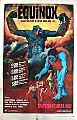 Anyhoo, the Slutty Girl gets killed (surprise), as do the Evil Guys. And the alien gets killed, which is meant to be tragic, because he was peaceful. It’s one of those endings where you’re supposed to be moaning "Oh, the humanity!" So all the good guys throughout the film keep helping the alien to escape. However, I guess he doesn’t have a functioning spaceship or something – I missed the beginning, remember – and so the hour I saw involved the bad guys capturing the alien or his gun and losing them again and then capturing them again and so on. Aside from that, highlights included the main bad guy’s carefully ripped T-shirt (of course, I yelled "Stella!!!", although to little humorous effect); the amazing variety of beer brands on display; a couple of ‘fight’ scenes where the participants literally moved in slow-motion to avoid hurting each other; some very ‘80s clothes; Slutty Girl’s big mole up on top of her cleavage, which provoked much audience discussion; the sequence where the filmmakers dug a little ditch in the ground and the characters pretended it was the edge of a cliff; and what is probably the single worst Falling Dummy effect I’ve ever seen in my life. Also notable, as Joe pointed out, was that it was scenes from this movie that were used as the unconnected credit footage in the Pod People episode of Mystery Science Theater 3000. So that question’s answered. Next was a very slow little stop-animated short with a Toy Story-esque Jack-in-the-Box assembling some moving wooden alphabet blocks into correct order. Here I had sport with school teacher Lisa, who mistakenly said ‘Y’ when the ‘W’ block was shown. That’s just the kind of person I am, I guess. The next feature was Equinox (1970), aka The Beast. This is a little cheapo horror flick made in the ‘70s that’s quite similar to The Evil Dead. Sci-Fi writer Fritz Leiber has a small role in it. Four college kids go into the woods and find The Necronomicon. A demon-possessed forest ranger named Mr. Asmodeus (oh, bru-ther!) calls up some of Jim Danforth’s lesser stop-animated Monsters to kill them. Their only protection is to fashion some branches into one of the various symbols of protection in the book. Despite the fact that one of these is a simple cross, they for some reason choose a much more complicated design to follow.