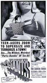 The appliance isn’t a TV, however, but a Twonky. This is a robotic device sent from the future or something (I didn’t quite catch this part) that for whatever nefarious purpose takes over its owner’s life. For instance, it won’t allow you to do small tasks, like light your own cigarettes, but does it for you with this rather adaptable cartoon beam it shoots out. However, its main purpose is to keep you from becoming mentally stimulated. (Just like TV!! Get it?!) Therefore it keeps its owner from listening to Mozart and from drinking coffee. It can even erase your thoughts if it chooses too. This all presented in a concrete form the fears of Oboler, and many others who worked in radio, that television was a tool of the Devil created to make people dumber. And, now that I think about it, they were pretty much right. The Twonky was one of a handful of films written and directed by Arch Oboler, the creator of radio’s oft-brilliant Lights Out program. Oboler was sort of radio’s Rod Serling. Unfortunately, he often proved more ham-fisted in ramming home his ‘messages,’ thus limiting the success of his handful of films. His most popular attempt at Serling-esque moralizing was Five, about a handful of people who are the only survivors of a world-wide nuclear holocaust. Despite this, no one’s learned anything. One survivor, for instance, is black, resulting in the specter of racism rearing its head again. Some will find this a tad obvious, some gripping. Roger Corman remade/ripped-off Five with the typically economical Last Woman On Earth. Also along these lines are The World, The Flesh and The Devil and, although less so, the more action oriented yet still interesting Panic in the Year Zero. After The Twonky Oboler’s film career went downhill fast. His next picture, nine years later, was the preachy One Plus One. A blathering message piece in favor of sexual freedom and honestly, it stands today as a creaky laughfest. Basically it’s a square’s version of The Harrad Experiment. (To be fair, it was also considerably bolder, having been made all the way back in 1961.) I imagine I’ll be getting around to that one someday. Oboler also directed the first 3-D movie, Bwana Devil, starring Robert Stack and based on the same man-eating lion episode that inspired the recent The Ghost and the Darkness. Meanwhile, his last film, produced six years after One Plus One, was a very late 3-D picture, The Bubble, which is available on DVD via Rhino. This one I haven’t seen. Despite the introduction provided by the man who owned the print, The Twonky isn’t a bad little movie. Although you can fairly say that is overlong and, like much of Oboler’s film work, somewhat obvious. And yet, as one of our party of attendees pointed out (Jennie, I think), its message is somewhat defused by the fact that the Twonky is seldom actually used as a TV. Next up was a collection of comedy sketches by Reno, Nevada horror host Zomboo, pronounced ‘Zom-bow,’ who was pretty funny. Unlike some of the hosts I’ve seen at NOWFF, this one I could live with. (Although I’ll still stick with Chicago’s Svengoolie, thank you very much.) Those interested in Zomboo can access his nifty website at Zomboo.com. Here it was about 6:30 in the evening and the rest of our party left to grab Chinese. As indicated, I remained behind and watched Bert I. Gordon’s Village of the Giants (1965). This film was introduced with a live appearance by Texas horror host Prof. Griffin, a rather good example of the breed. He boned up (hee, hee) on the film and gave a notably good intro. As he had last year for Attack of the Crab Monsters, a presentation that netted him this year’s Golden Slushie award, a statuette the NOWFF people give out each year to those who help make the event successful. Bert I. Gordon, or "B.I.G.", of course, had a thing about large people and animals. Thus made he Beginning of the End, Empire of the Ants, Food of the Gods, The Cyclops, The Amazing Colossal Man, Earth vs. the Spider and War of the Colossal Beast. (He also made Attack of the Puppet People, but the mad scientist in that was a giant to the shrunken remainder of the cast, so it still fits.) Village of the Giants is his comic take on such material. Little Ronnie Howard, playing the precocious Genius, accidentally invents a Food of the Gods-like substance he calls Goo. Eat it and you grow real big real fast, although I’m not sure where all that extra mass is supposed to be coming from. Eight bad teens, lead by Beau Bridges (!), eat the Goo and take over the town. They are opposed mostly by good teens Tommy Kirk, an actor who should definitely be hitting our site sometime soon, and Jimmy "Rifle Man" Crawford. Crawford ends up hanging onto a plaster mock-up of one of the giantess’ boobs (covered by a giant homemade bra, of course) as she dances.