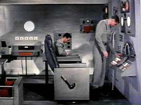 The CO introduces the renowned Prof. Konrad, who proves a rather avuncular sort. Following which the crewmen are presented, both for Konrad’s benefit and our own. Capt. Patterson is the stalwart and no-doubt revered commander; Lt. Cruze, a short, wizened sort, will undoubtedly prove to be the can-do cynic; and young Lt. Larry Turner will no doubt be the headstrong and brash one. Informed that they are to ferry the Professor to "Space Station A" – catchy appellation, huh? -- the men evince obvious, open-mouthed disappointment. (See my prior note re: military protocols.) The CO quickly chews them out, as he no doubt would, although it seems unlikely they would have actually acted in such a manner in the first place. "Mission not important enough for you?" their CO barks. This unsurprisingly sets up some exposition…of the future!! First, Prof. Konrad is a bigwig scientist. Second, as Patterson explains -- I’m not sure whom to, as everyone in the room knows all this -- "Space Station A is [Konrad’s] brainchild. He fought for it, he built it!" While acknowledging that the assignment is perhaps an important one, he admits that they were hoping for the imminent exploratory trip to Mars. The CO promises that they’ll get that job, but notes that something peculiar is going on at the station. It’s therefore paramount that Konrad get there as quickly as possible. The men are dismissed to ready themselves, but ordered to discuss the assignment with no one. We cut to what I’m assuming is stock footage of a very strange and stubby little rocket. Then we cut inside of it, which proves, inevitably, rather roomier than its outside dimensions would suggest. Cruze is manipulating a few random switches on one on those panels featuring dozens of illuminated yet unmarked little levers and dials. He then starts bitching anew about their being handed a "milk run." During this the camera pans across the still suspiciously large chamber, which contains several leatherette Space Barcoloungers – at least this isn’t one of those movies where the rocket is furnished with wheeled office chairs – and other bits of vaguely futuristic equipment.