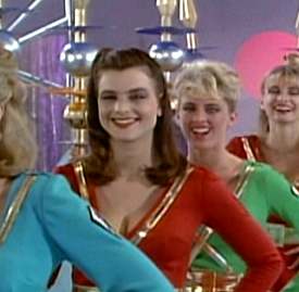 weakness most unbecoming of a Queen." Patterson moves in to close the deal, but she angrily refuses to take her mask off. "You’re certainly making it difficult," he replies in frustration. (I get the impression that this isn’t the first time he’s said that to a woman.) Yllana, meanwhile, provides a window into the uncanny, alien behavior of women on another planet. On Venus, apparently, females in romantic situations will one minute run hot and the next cold, leaving a guy flummoxed and confused over what they want. Thank goodness it’s not like that back here on Earth! Still, Our Stalwart Captain’s obviously having an effect on Yllana. "I can see you’re no novice at this, Captain," she bitterly retorts. No kidding. A little patter and then, bang, he tries to get in your mask. She’s not having any of it, though. "Did you promise your men you’d sweep me off my feet?" she acidly inquires. "Use your male magnetism to win freedom for all of you?" Seeing his plans unraveling before his eyes, Patterson tries to save the day with a sly bit of subterfuge. "Certainly not," he blandly replies. "Whatever gave you that idea?" Good one, dude. That should do it. Yllana, on the other hand, keeps demanding details on Earth’s invasion plans. Which, since there aren’t any, prove difficult to provide. "Let me show you what happens to those who oppose me!" she says. She walks over to a flat-screened close-circuit TV monitor, which is one of the film’s more accurate postulations, especially with its handheld remote control unit. Activated, this show a comically bad set whose sophistication fails to rival that of King Friday’s realm from Mr. Rodger’s Neighborhood. Basically it contains a big white box with gold polka dots and being serviced by randomly strolling chicks in miniskirts and high-heeled boot. "Look, Captain!" she preens. "The Beta Disintegrator!"
