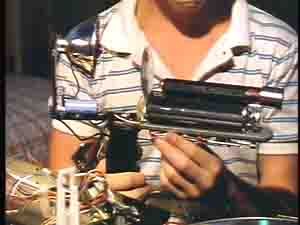 means in terms of his activities over the last twenty hours or so: Late Night/Early Morning: I don’t know, that doesn’t strike me as a terribly convincing emotional arc. In any case, the two end up in the local movie house, laughing uproariously at extended clips from Disorder in the Court. This—coincidentally, I’m sure—just happens to be one of the few Stooge shorts in the public domain. However, it also has one of the funniest moments ever put on film, when Larry’s violin bow snags a man’s toupee, and suddenly seeing it hanging there, he pops his eyes in horror and cries, "A tarantula!!" Wisely, this bit is seen here, although since it’s more authentically scary than anything that actually happens in the movie, it does undercut things a little. By the way, in the theater Morgan is wearing glasses—again, I barely recognized him—leading me to wonder where the hell he was carrying those all this time. In any case, the couple has a grand old time, which once more brings me back to Morgan’s dead coworker and all that stuff. On the other hand, perhaps he’s just a lot more stoic than I am. We return to Joe’s house, where the elderly gentleman is questioning Jonathon about his current, er, present project. Joe admires his grandson’s enthusiasm, but is a bit concerned about his grandson playing around with a device that can flash fry a house pet. Jonathon, for his part, has no such qualms, and he quickly manages to put Joe at ease. Soon, Our Precocious Scientist is soldering things to other things and soon has mounted the laser projecting equipment onto a ergonomic pistol frame.