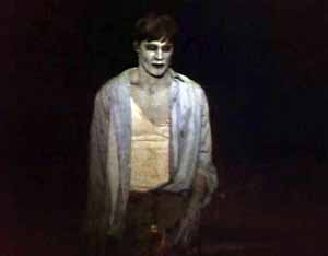 Shelly suggests he try to get information on the apparent institution from the town historical society. She tries to join him, but he’s worried about her getting further involved sends her home. Unfortunately, Shelly arrives there to find a couple of undead visitors waiting for her. These are of the more elaborate variety, as opposed to the purely greasepaint ones we get in some scenes, again suggesting they come from another movie. Comically, however, they only had ‘zombie’ gloves for one, and thus one elaborately desiccated shambler noticeably sports normal flesh-colored hands. Also on the scene is their master, the Man in Black. At his direction, Shelly isn’t killed but instead is touted off. I have to say, the ability of these zombies to move around this little town, here in broad daylight, mind you, without being seen is pretty darn impressive. Next Morgan (I guess) is having a rather stark nightmare,