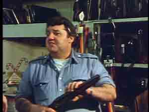 contents on the ground and then makes a trail of the stuff. The camera eventually pulls back, and given where he and the zombie have ended up, we can definitely see that there was no good reason for the Reporter not to have run straight for his car. Except, of course, that then we would have missed all this excitement. In any case, he does so now. I hope you’re sitting down, however, because it turns out that the engine won’t start. (By the way, from what the Photographer saw, it would have appeared that the Reporter had set a trap and burned a guy alive. Why would she have unlocked the car door?) With their departure thwarted, the two run from their vehicle. Soon Greasepaint Zombie is seen walking around nearby. It strolls past them, but just when the two think they’re safe, the Reporter is jumped by the Maybe Master Guy, who for some reason sports oily hair and a black leather jacket and appears to have taken the whole ‘Fonzie’ craze way too seriously. In about five seconds he strangles the Reporter to death, or unconsciousness, or something. In any case, he falls over much too quickly, given his apparent fitness and youth. Meanwhile, the Photographer—who of course just watched all this without bothering to lend her comrade a hand—falls prey to Greasepaint Zombie. Cut to morning. A guy, obviously beaten up, is staggering down a rural road. Back when my friend Andrew and I saw this movie on TV, we were confused as to whether this was supposed to be the Reporter. See, he seemed like another guy entirely. And now that I am seeing the film again, and was waiting for this, I can definitely state that he does look a lot different. Now, as I’ve admitted in other articles, my brain’s facial recognition software is pretty bad. Even so, and upon more leisurely examination, I think it might be the same actor after all, although I suspect he shot the scene beginning here some time earlier—his hairstyle is different, for one thing—with the Colter Farm stuff done years later at the bequest of producer/director Sam Sherman, in order to flesh out the previous footage enough to make it (if only barely) releasable. The Guy tries to flag down a car and gets tagged by it for his trouble. The vehicle pulls over, and naturally the driver proves to be an attractive female. Being a movie character, she takes him to her house rather than a hospital, and we next see him wolfing down breakfast at her place. Here she’s wearing a nurse outfit, so I guess that makes taking your hit and run victim home with you quite all right. Astoundingly, the Guy finally deigns to name himself as being Morgan Randall—so yes, he is in fact the Reporter—while the woman’s name is Shelly. Morgan seems in fine health and spirits, considering that he was just recently chased by the living dead, strangled by a refugee from Grease and soon after summarily struck by a car. In fact, he’s so much recovered that the large facial bruise he exhibited just a minute ago is now completely gone. Even so, I don’t know, you’d think maybe he would want to tell somebody about how his co-worker was killed. That just seems like something you’d want to take care of. Instead, his first impulse is to talk Shelly into letting him do the dishes. Afterward, he asks for a ride into town. Taking his leave of her, Morgan enters a phone booth and uses the Yellow Pages to get the location of a gun shop. Soon afterward he is looking over some weaponry. When his behavior rouses the store owner’s suspicions, he takes on the persona of a redneck, spouting off about liberals and do-gooders. I think this is supposed to be funny—although, really, how could I possibly prove it?—with the idea being that anyone who would run a gun shop would by definition be the sort of dense, reactionary hick who would be put at ease by this sort of talk. Needless to say, Our Hero’s gambit works and the shop owner is indeed put at ease. Meanwhile, despite noting only a moment ago that he needed to be careful these days, the shop owner now casually reaches under the counter and hands Morgan a clearly illegal sawed-off double barrel shotgun. I have to admit, though, that this would a pretty decent anti-zombie weapon. Also, and I don’t wish to pummel a deceased equine here, despite Morgan’s earlier contention that his sole responsibility is to get the story, I still believe most folks would, after all this, decide that maybe the authorities should be consulted. Anyhoo, Morgan soon strolls out of the gun store carrying his illegal weapon tightly wrapped in butcher paper, just to make sure everyone will have a pretty good idea of what it is. Way to stay stealthy, my friend. His next stop is to rent a room in a boarding house. This accomplished, he then telephones Shelly to—I swear!—badger her for a date (!) to see some Three Stooges shorts (!!) at a local theater. Shelly is reluctant at first, telling him not to read too much into the fact that, as she says, "I’m really glad that I helped you out." Oh, was that after you ran him down with your car?