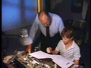 the definition of ‘rock’ music is a lot looser than I was aware. Having succeeded in getting Jonathon into turning off the music—and I can’t really argue with him there—Joe begins rambling on about how he took his busted laser disc player in to be repaired. (For younger viewers, a laser disc was an LP-sized video format. Imagine if the Soviet Union was still around, what their DVDs would be like, and you’d be pretty close.) However, they wanted too much money, so he took it home. "Why don’t you let me look at it," Jonathon offers, doubtlessly hoping this will placate the old geezer and that he’ll finally leave. Needless to say, as a nerd Jonathon should be able to effortlessly fix any electronic device. Hell, he’ll probably soup it up in some comical fashion. Before we cut away, I want to compliment the filmmakers on