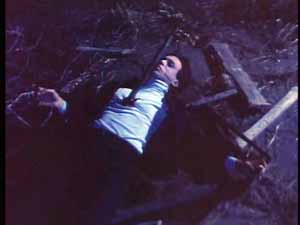 The main item on the disc is, however, a third (!!) version of the film, entitled Dark Night. This is Sherman’s original revision of Dying Day, and is a midway point between the Piper’s film and the eventually released Raiders of the Living Dead. It is, for instance, the version that introduces the Carstairs character. Here, however, Carstairs is the main villain of the piece, being the father of the Man in Black. The kids aren’t in the film, which allows for Carstairs to be a heavy, as well as removing the ludicrous homemade laser pistol angle. With Dying Day’s generational revenge angle removed, Dark Night is already markedly inferior to Piper’s original. Unsurprisingly, many, if not all, of the final work’s continuity problems originate here. It’s not as outrageous as Raiders, of course, lacking the terrorist opening and other problematic material. Still, perhaps the biggest laugh I got out of the set was when I scanned the promotional text on the back of the DVD case and read, "Sherman decided to re-shoot the film as Dark Night. Buyers were happy with the improvement in the film…" After reading that, I laughed out loud. Despite featuring much of the same material that appeared finished in Raiders, the 72-minute Dark Night print is much more problematic than that for Dying Day. A lot of the sequences are silent, including scenes that have sound in one or both of the other two versions, and there are even shots that pop up in black and white. Dark Night begins with a generally soundless edit of the Man in Black’s graveyard zombie resurrection. One oddity of this print is that, aside from generally looking like crap, the footage from Dying Day is often much better lit than in the final version of Raiders of the Living Dead. Apparently they processed the footage to make it darker, presumably to aid in the idea that it was taking place at night or in dark surroundings. However, this turns out to have been a really bad idea. Stuff that looks pretty good here can barely be seen in the final film. Check out the attack on Morgan in his boarding house for an example. We see a scene where (I guess) reporter Morgan’s editor is reading some notes he’s sent in, or something. Cut to Morgan stumbling through an obviously real life Halloween/Mardi Gras type affair taking place in, I think, New York City. Here is where he falls and is aided by Carstairs. Morgan is again taken to Carstairs’ office, but here when they enter, we see the Dr. removing the mystery gloves I mentioned earlier. I think this action was clipped out of shot in Raiders. Here Carstairs hasn’t yet been told about the zombies or Morgan having killed one (as this hasn’t occurred yet here), so his acceptance of Morgan not wanting to contact the police makes rather more sense. When Morgan does fill Carstairs in, it revolves around the scene with him and the Photographer heading out to the farm. Here they expect to witness some sort of occult cult ceremony, as established in dialogue heard here but clipped out of Raiders. Morgan enters the barn and things progress as they did in Raiders, including the eventual attack in the woods and zombie immolation that appears in all three versions. Here again the photographer is killed and Morgan left for dead, and onto the scene of him on the road, being hit by Shelly’s car, etc. Things progress as in Raiders for a while, although with more footage left over from Dying Day, presumably further trimmed in Raiders to allow for the subplot with the kids. Morgan gets his gun, rents his room, goes out for the date, is attacked in his boarding house, etc. Again, the zombie attack looks a lot better here, although the soundtrack isn’t complete. It’s too bad this sequence was so ruinously darkened for the Raiders revision. Shelly is again called to the boarding house, and again meets Kapek, who is again only the coroner and not a villainous mastermind. There follows a previously unseen bit where the fleeing Morgan calls Carstairs from a pay phone. When the conversation ends we see the Man in Black in Carstairs’ office and realize he’s a bad guy. However, the fact that Morgan would contact Carstairs is much more poorly motivated here than in Raiders. On the other hand, Carstairs being a villain makes his advice to Morgan, that he should avoid the police, a lot more believable. After the call, Carstairs talks to his son, noting, "These