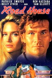Let us look at the strange, sad case of Patrick Swayze. Patrick made his name with Dirty Dancing and Ghost, two of the gloopiest movies ever to unspool. Filled with more syrup than Vermont, the two films were undeniable box office hits. (I admit to a soft spot for Ghost but I have never, ever, understood the appeal of Dirty Dancing.) Patrick’s troubles began when, instead of capitalizing on the massive popularity of Ghost, he withdrew to make an "important" movie. He emerged with City of Joy, a dreary film in which he was woefully miscast. It sank without a trace and his streak was over. Roadhouse actually came between his two blockbusters. Still, it provides a glimpse at what Patrick would spend the rest of his career doing. Its excessive violence and good guys-versus-big bad capitalists theme would be echoed in later masterworks such as Black Dog and Father Hood. Yet let’s not get ahead of ourselves, we have this turkey to carve. We open on a long, slow shot of a neon sign. Sloooowly we pan down the sign (we do have nearly two hours to fill). Generic Rock Ballad # 1 picks up. The sign reads Band Stand and underneath it "LIVE MUSIC" flashes off and on. Pulling away to show a parking lot in front of the club, a cherry of a sports car pulls into a space. The door opens and a shapely pair of legs ending in high heels appears. Did I rent To Wong Foo by mistake? The camera takes a good bit of time to check out these legs and follow them into the club. As it pulls back we see that their owner is wearing a Lyrca dress with big Day Glo squiggles on it. She’s also suffering from poodle hair. I should warn you now this movie is stricken with a bad case of The ‘80s. Incidentally we never see the girl’s face and she never appears again. Well, it did eat up half a minute. The camera focuses on a white limo pulling up to the doorway of the club. "Airport Limousine Service" is spelled out on the door with those gold letters you buy at the hardware store. Out steps a ruddy-faced man. He’s decked out in Miami Vice reject duds; gray sports jacket with sharp lapels, black shirt, pants and a bolo tie. He walks up to the bouncer at the door, flashes his card and is let in. He ambles through the crowd. The camera goes over the customers to the band on stage, the source of Generic Rock Ballad #1. The lead singer resembles a svelte Meat Loaf. The ruddy-faced man looks around at the swinging joint. Close-up on people placing money on trays. Next a Gold Am Ex is dropped on one. A looped in voice cracks, "How bout some gold plastic?" A slang term so lame I don’t believe it ever caught on, even in The ‘80s. The ruddy-faced man’s gaze travels to a Mullet. Underneath that Mullet is the inimitable Patrick Swayze. He is jerking his chin up and down, supposedly in time to the music, but instead looking like a pelican swallowing a fish. A sound of breaking glass is foleyed in, and Patrick’s Mullet turns. It seems a deal has gone sour between a pair of women and two men. One of the guys kicks a lady out of her chair. A fight is about to break out but several black shirted and burly bouncers appear and subdue the pair. The willowy Pat ambles up. The dark haired one assures him they were doing nothing wrong. Pat nods his head, signaling for them to be escorted out. Once let go the man lunges at him with a knife and gets him good in the arm. Restrained again, he sneers "Okay, Dalton. I’ve always wanted to try you, I think I can take you." Patrick purses his womanly lips and intones "Outside". The two men are dragged out and turn to face Patrick. He eyes them coolly for a moment and then…walks back inside. The rest of the bouncers block the goons’ reentrance. Patrick walks by the Ruddy-Faced Man, who follows him. The GRB #1 still plays over the screen. It’s an imaginative little ditty that advises the listener to "Don’t Throw Stones." Good advice. Rotten tomatoes are a much better choice. Cut to the bathroom where Patrick/Dalton is sewing up his sizeable wound. Throughout this film Patrick will be shown to react to even the most intense situations with the same stoic countenance. It’s supposed to make him seem to posses a Zen-like tranquility. Instead you wonder if Patrick took a few horse tranquilizers before showing up for the day’s filming. The Ruddy-Faced Man asks if he can speak to him. Patrick eyes him coolly, "I don’t know you." The RFM (I’m sick of typing that out) nervously clears his throat. "The name’s Tillman, Frank Tillman." He puts on his expositor cap and talks about how he owns a bar "just outside Kansas City", the Double Duce. He laments that it used to be a "sweet deal." Lately, though, it’s become the kind of place where you "Sweep up the eyeballs after closing." He mentions that he has come into the some money, and at the world money he breaks into an evil grin. [Future Jessica: Actually, despite his suspicious behavior here, he turns out to be on the level. I don’t know if his performance was intended to cast a red herring or merely plain bad acting.] He needs a ‘Cooler,’ a sort of head bouncer, and Dalton’s the best. Funny how in Movieland, no matter how marginal the occupation, there’s always "The Best." I wonder what it means to be "The Best" bouncer. "Gee, Ted, when it comes to dislodging the jawbone with one blow nobody does it better than you." We are spared further reflection by Dalton’s low-key (what else?) response. "Wade Garrett’s the best," he avers. "Wade Garrett’s getting old," comes the reply. "He’s still the best." Wow, the screenwriter earned his dime here, I must say. Patrick states, "Five thousand up front, five hundred a night. You pay for all medical expenses. I run the show, my way. When it’s done I walk." Somewhat nonplussed at being put in his place, Tillman reluctantly agrees. He offers Patrick a plane ticket. Patrick refuses. "I don’t fly, too dangerous." Ah the Cool Irony of our hero, ladies and gentlemen. You see, 