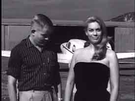 Once he comes closer to the camera, he turns out to be Pete. Perhaps Pete is so intrinsically zany in his own person that he warrants comedy music whenever he appears. In any case, he calls Harry and Beth together, noting that he wants to try a free fall from 5,000 feet, wanting to wait to open his ‘chute until the rather dangerous 1,000 foot mark. His suggestion is met with disbelief, as such antics could get the airfield in trouble with the FAA. Joe, looking on, proves as fascinated with the motives of these daredevil skydivers as any of us are. (Uh, right?) "What do you get out of altitude jumping?" he asks. "I don’t know," Peter responds. "I feel real free up there in that high blue sky. Nobody to tell you what to do, you just have to please yourself up there." (Man, I hope that doesn’t mean what I think it means.) Here I was hoping Beth would jump in with her "Maybe we jump because we’re scared, or to prove that we’re not scared" theory and kick off a further round of this fascinating discussion, but sadly it wasn’t to be. Furthermore, they unhappily also miss the opportunity to plumb Pete’s opinions on coffee. Harry gets Pete to promise to pull his cord at 2,200 feet, and they head over to a plane. Joe and Beth, meanwhile, remain behind to look on. Again, Francis ably suggests the plane in flight by staying very close on the actors, turning on a fan to blow their clothes and foleying in engine and wind noises. Eventually, they reach the proper *cough, cough* altitude, and Harry signals Pete to jump. He does so, and free falls for about three seconds before Joe warns, "He’s about 2,000 [feet]." Apparently he fell those first three thousand feet quick quickly. He and Beth wait for him to open his parachute, but it’s apparent that Pete’s decided to go with his original plan. "Why doesn’t he pull?" Joe gasps, and Beth replies, "Panic!" For whatever reason, Pete never does engage his ‘chute, and soon hits the ground. Well, anyway, at some point he’s on the ground, and the camera cuts to a shot of him lying prone. Beth and Joe run over, in an arm-pumping manner so reminiscent of the running man sequence in The Beast of Yucca Flats that I can only assume that Francis actually directed his actors on how they should move their body while in movement. They reach Pete’s body, which looks in surprisingly good shape, considering, although Beth does find a patch of stage blood on him. We cut to Harry and Beth conferring with an FAA inspector, who informs them that the field will have to remain shut down until the investigation is over. This puts the two in a bad spot, as the place is heavily mortgaged and they aren’t exactly cash rich. Meanwhile, Beth nearly broaches with Harry the subject of their troubled marriage, but backs off at the last minute. Later that day, Harry is seen parking outside a bar called The Sky Diver. (Man, that is one weird little burg.) He enters and gets a beer. He and his fellow afternoon lushes sit and drink and listen to songs on the jukebox until Suzy arrives. Needless to say, we don’t just see her enter the bar, but instead watch as she parks her car outside. You can never have too much footage of people in their cars. As she parks, Harry finishes up his beer and exits. I guess he’s psychic or something. No, wait, the whole things just a coincidence. As he walks in a different direction than that in which he had parked his car, they meet. Harry, however, has decided to break things off. "You’re a broad," he declares. Despite the fact that there are many more pertinent remarks he could have made, she takes offense and begins beating at him with her purse—at the time this was known as the Ruth Buzzi Maneuver—until he finally violently pushes her away. He leaves and she casts a "this isn’t over" glare at him. We cut to two people cavorting on a speedboat that night. Here the footage was so poorly lit that it took me a while to ascertain that the woman was Suzy, and I didn’t identify her partner as being Frankie until well after that. Not one to let the grass grow under her feet, our Suzy. They park the boat and get out onto the beach for a nauseating little From Here to Eternity moment. Well, at least they got the ‘eternity’ part right. Lying on a blanket beach, Suzy uses her wiles on the hapless Frankie. First, she tells him she can get him his job back at the airfield, which obviously doesn’t seem a very likely idea that this point. Even Frankie figures this out, and he’s not exactly the sharpest knife in the drawer. Then she begins talking about Pete’s accident. Frankie notes that he himself once panicked and was nearly unable to deploy his ‘chute, an incident that led him to give up the pastime. Finally, though, Suzy gets to the subject she’s really interested in. "Frankie," she ponders, "suppose somebody put acid in somebody’s ‘chute?" Frankie ponders this brainteaser, before offering that "Acid would eat holes in somebody’s ‘chute." Yep, nothing gets past ol’ Frankie. He also figures out where she’s going with this, and raises concerns about being caught, but she, er, distracts him. After making out for a bit, Frankie draws back. "Suzy, what makes you so mean?" he asks. Referring to a guy named Paul, who I can only guess was once her husband (although he’s a character we’ve not only never met but one whose existence has not been touched upon before), Frankie continues, "Paul gave you everything. Nice T-Bird, a speedboat, beautiful ranch, horses and cattle. You’ve got everything a girl needs." Suzy, however, rejects Frankie’s materialist values. "My Paul," she pensively responds. "He gave me everything. He gave me too much. We were always alone together. He didn’t think I needed anybody else. He followed me everywhere. Everywhere." This is mesmerizing stuff, although unfortunately we cut away before Frankie can ask for her views on coffee or the motives of skydivers. Joe joins Beth in 