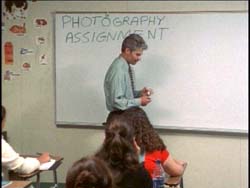 of movie where you go, "Oh, yeah, that murder thing. Right." Meanwhile, I’ve been wondering why she hasn’t gone to the authorities. We get the answer to that conundrum now. Having apparently collected her murder evidence from the Photo Hut, she takes said pictures to the school principal. (??!!) In a further example of Cahill’s fine writing chops, this fellow remains unnamed throughout the movie and is identified in the end credits as "Principal." He is played by middle-aged actor Jason Peters, whose craggy face and pony tail hair all but scream ‘Porn Actor.’ Indeed, his other credits mainly consist of small roles in a series of Donald Glut soft-core sex flicks. Needless to say, the fact that Yajaira has gone to the Principal rather than the police means that Principal (write these friggin’ characters some names next time, Cahill, you putz) is the leader of the inevitable murderous drug ring that Blacky is the enforcer for. Now, even if for some reason you thought ‘Principal’ appeared on the chain of command before ‘Cops’ when one is reporting a homicide, you’d still think that Yajaira might have pondered the wisdom of going to a school authority figure when another school authority figure is the one who committed said murder in the first place. Anyway, Yajaira meekly goes off after Principal promises "I’m going to take care of this." (Bum bum bum.) She does extract his promise that he won’t identify her. Hey, Brainiac, here’s an idea: If you wanted to remain anonymous, why didn’t you just mail the photos to the cops? Yeesh. Back to English Class. (Not to stereotype, but how many inner city schools have a student-teacher ratio of twelve to one?) Rodrigo and Sergio are backtalking the teacher about the lack of Chicano Culture being taught. Wow, what a hard-hitting, timely script this is. I guess the reason these guys join gangs and sell drugs and commit murders and whatnot is because they are forced to write papers about Dead White Dudes like Walt Whitman rather than the novels of magic realist Gabriel Garcia Marquez. Because, you know, you can only ‘relate’ to works by someone with the same racial background you have*. [Jabootu consultant and nitpicker extraordinaire Carl Fink clarifies: "You probably know this, but Gabriel Garcia Marquez is not Chicano (which means 'Mexican-American') and isn't of the same racial background. He does LIVE in Mexico, but he's Colombian." Actually, I didn't, but then all this racial stuff strikes me as a bunch of malarkey anyway.] [I remember years ago reading a ‘professional’ editorial in an education magazine wherein a teacher queried how "Chinese students" (by which she meant American students of Chinese extraction, as if that were the same thing) could possibly be expected to relate to the writings of Shakespeare. The idea that Shakespeare has endured in pretty much all cultures for hundreds of years because of the essential universality of his themes—jealously, pride, ambition, lust, envy, etc.—apparently didn’t occur to her. I wish I still had a copy of that piece; it remains one of the most appallingly ignorant things I’ve ever read.] The upshot is that Rodrigo and Sergio are booted out of class to roam