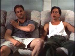 those few pictures which get looked at attention grabbers." We cut to a park, where some gang-bangers—we can tell from their knit caps and flannel shirts, which are solely buttoned up on top—are preparing to engage in an illicit deal of some sort. Or so I deduced given that one of them, McClure (Cahill, in a performance that handily encapsulates every negative aspect of Eminem’s influence on suburban white guys), is carrying an attaché case. Yes, the police would never find that suspicious. McClure begins to open the case. His would be customer, Big Hispanic Dude, reacts by pulling a gat; or whatever the kids are calling them these days. However, McClure reassures him and his compadres that his intention was only "showing you some product." Word. By the way, congrats to screenwriter Cahill for keeping any of the film’s Hispanic characters from using the term ‘ese’* for an impressive two and a half minutes. Furthermore, when the rod—or whatever the playas are calling them now—is produced, the wielder astoundingly doesn’t threaten to cap anyone’s ass. [*I will say, they make up for lost time during the rest of the movie. If I had a buck for every subsequent use of ‘ese’ or ‘vato,’ I could film five more films just like this one.] The case contains a ludicrously huge amount of smack, or whatever the homies are calling it days. "Man," Big Hispanic Dude asks, producing a (three guesses) switchblade, "you don’t mind if we take a little taste, ese?" So saying, he uses his blade to slit open of the bags. Seriously, dudes…Ziploc bags! I don’t know, if I were carrying thousands of dollars worth of loose powder around in a plastic baggie, I wouldn’t want somebody cutting a hole in it. Maybe it’s just me. In any case, one whiff later and BHD exclaims (I hope you’re sitting down), "Good sh*t, vato!" Man, this dialogue is ripped from the streets! BHD then pushes McClure to the ground, while his sidekick pulls a roscoe, or whatever the gangstas are calling them now. BHD, you see, wants to see McClure snort some of the drugs, presumably so as to establish that he’s not a ‘Five O.’ [Slangmaster Ken: That’s what the homeboys call the police.] Oh, and the gunsel is named "Trigger." That’s just good writing there. As it transpires, McClure is a cop, which we kind of knew because they cut away for absolutely no reason to show us a bum lying under a pile of newspapers on a nearby bench. When McClure is threatened this fellow, who goes by the name of Burke, leaps up, pistol at the ready, and orders the bad guys to freeze. BHD runs off, McClure awkwardly busts some extremely rudimentary kung fu chops on his associates, and Trigger is blown away by Burke. The action is well-framed, in a way, anyway. By which I mean that since they apparently couldn’t afford blanks for Burke’s gun—or perhaps they couldn’t afford a prop gun that actually shot blanks, or maybe they were filming without a permit and didn’t want to shoot blanks off and attract attention, or whatever—his gun barrel extends just off camera. This means that we don’t notice the lack of muzzle blast, or that his shots are indicated by looped-in shot noises. I guess I could quibble and wonder why his gun fires two distinctively heard shots when he only pulls the trigger one time; or why shells aren’t being expelled from his semi-automatic as he ‘fires,’ but why nitpick? Meanwhile, McClure unconvincingly snaps one guy’s ankle, and several crooks are shot down with an entirely too noticeable lack of blood. I mean, OK, so you couldn’t afford squibs. Still, couldn’t the actors have burst some blood bags with their hands or something, or leak a little ketchup out of their mouths? Yeesh. McClure also shoots a guy, again via the amazing "Just Loop in a Gunshot Noise" technique. This time, they don’t even bother framing the muzzle out of the shot, so maybe it was just inadvertent the first time. With Burke having had the breath knocked out of him—he was shot, but saved by a vest—McClure takes off on foot after BHD. As the latter is rather beefy and out of shape, their footrace doesn’t generate overmuch suspense. Also, he has an oddly fey little heater, or whatever the bangers are calling them now. (Moreover, it magically changes from a semi-automatic to a revolver at one point.) In his haste, BHD accidentally drops the case. As it hits the ground it pops open and spills a huge cloud of drugs all over the place, despite the fact that it was all in discrete plastic baggies a minute ago. As the stuff blew away (What? An allusion to The Treasure of Sierra Madre? LALALALA I CAN’T HEAR YOU!!), all I could think of was how McClure was going to explain the disappearance of millions of dollars worth of evidence. The chase continues for a while, mostly because BHD is allowed to really over-use the power of Offscreen Teleportation. I mean, when on-camera the guy runs like a pixilated Fatty Arbuckle, yet somehow the notably fleeter McClure keeps losing ground. Eventually, though, we are treated to more Pretending to Shoot Stuff—seriously, they may as well just have had the actors point their fingers at one another and yell "Bang! Bang!"— followed by McClure demonstrating his mastery of Stooge Fu, an obscure martial art that involves hilariously cartoonish sound effects being heard whenever one’s foe is (almost quite nearly) struck. This is all no doubt meant to establish the rather shrimpy McClure as a Rampaging Badass, although the effort is…not entirely successful. Once BHD is subdued, McClure hauls him back to the park. On the way, we are treated to what appears to be a (lame) gag, wherein a guy smoking a joint sees McClure the cop coming and quickly ditches his roach. However, this character, who I shall dub Reefer Guy, in fact appears later in the film and in reference to this very scene. Meanwhile, back at the High School, we are privy to a teacher