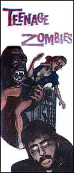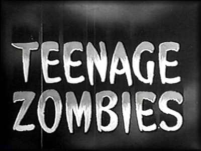 My august comrades in the B-Masters’ Cabal and I have marshaled our forces to investigate many strange cinematic phenomena. Initially, we gathered to scrutinize the episode of a Giant Cerebrum of Unearthly Origins, whose lust for power on an interplanetary scale proved its downfall. We subsequently have pondered tales of fantastic behemoths that did wreak misery and destruction upon the modern world of Man. We have even born witness to mighty cataclysms which brought about the destruction of human civilization itself. Not even there did we pause, however, for we then studied a myriad of bizarre dystopias that might have arisen from the very ashes of those lost worlds. Yet here today are we assembled again, and to investigate what is perhaps the most phantasmagorical subject of all: Members of the Fair Sex who have unnaturally forsaken womanly pursuits in the name of Science. Pondering such a seemingly inexplicable curiosity, one calls to mind a famous epigram credited to the estimable Samuel Johnson. His biographer Boswell had just finished recalling an extraordinary tableau beheld earlier in day, when he had witnessed a woman unaccountably engaged in the act of preaching. Responding to the account of this singular incident, Mr. Johnson replied, "Sir, a woman’s preaching is like a dog’s walking on his hind legs. It is not done well; but you are surprised to find it done at all." Readers of these correspondences may plausibly react with incredulity when informed that even a single motion picture exists which employs such an outré and aberrant premise. Astoundingly, though, several such cinematic artifacts were unearthed. That in each a woman’s unseemly Pursuit of Knowledge should go horribly astray, however, should not surprise us. Catastrophe can be the only result when the Natural Order of the Universe has been so brazenly disrupted. Few would deny that the weaker sex has neither the aptitude nor the temperament for engaging in the meticulous and systematic experimentation that the Mastery of Science demands. The rigorous logic, discipline and patience required for such toil is denied them, as Man has likewise been denied the nurturing and empathic nature that are inherent to the very essence of the female. Furthermore, the wretched creatures portrayed in these cinemagraphs do not seek the creation of such things as a woman might seemingly turn her mind to, had she the faculty and the perverse will. No technologically advanced sweetmeats or custards do we espy, nor are innovations in the feminine arts of dressmaking or housekeeping to be witnessed. Instead, these distaff scientists, like the mythical Icarus, seek forbidden knowledge that has ever been denied our kind. So it was with Eve, and so it is with her defiant progeny. Choosing which feminine misadventure to examine proved a relatively simple task, in that Teenage Zombies affords us the opportunity to revisit with some of our former associates. Our subject today reacquaints us with writer/director Jerry Warren and star Katherine Victor, lately seen vacationing on Frankenstein Island. Indeed, we shall note some rather, uh, extensive thematic elements that this photoplay has in common with its latter-day counterpart, despite the intervening twenty odd years. We open with credits accompanied by the main theme from Kronos. I had mentioned in my review of that film that the music had sounded familiar. Now I know why. If Warren’s using it, it’s because the score had become ‘library’ music, or music available either free of charge or for a slight licensing fee. Knowing Warren, I’m assuming the former. One can only speculate on how many cheapo films and television programs have used this music since its initial appearance. We open the film proper with an establishing shot of the Campus House, a dining establishment whose sign entices prospective patrons with the promise of "FINE FOODS". Certainly it can’t hope to attract custom with its decor, as the establishment resembles nothing so much as a set from a micro-budgeted motion picture. Inside, a fellow garbed in full Soda Jerk regalia is delivering malted milkshakes to a trio of somewhat overage teenagers who appear to be right out of an Archie comic book. Following this, we are treated to the sort of wry badinage notable mostly for the amount of audience pain it manages to inflict in a short timeframe. Through this mechanism we become acquainted with our cast. Reg is the obvious lead character and Julie his inevitable blond Best Gal, complete with ponytail and cardigan sweater. Morrie, meanwhile, is an evident second banana and presumed comic relief character. His girl, we shall subsequently learn, is Dotty. By which I mean, that’s her name.