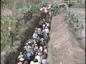 However, unlike in real life, this atrocity was not the unauthorized result of men driven mad by war. Instead, Billy’s platoon enters a village and herds all the villagers down into a large, deep trench. (Where this came from is left unexplained. The excavation is huge, but seems to have been found there when the soldiers arrived.) The villagers are naturally entirely innocent of aiding the enemy in any way and solely consist, as Billy notes, of "women, children and old men," who were "frightened and very eager to please." They are kept standing in the hole for hours "in the boiling sun"—humorously, the sequence was, in fact, shot on a conspicuously overcast day, but never mind—while the squad awaits orders. Said orders, "clear as hell, direct from Saigon," eventually come through. As you’ve no doubt intuited, the squad is explicitly, and illegally, I might add, commanded to murder the entire helpless village. Naturally, the squad leader immediately knows that he’ll have problem with Billy over this, and turns to him. "If you fellows refuse, all hell can break loose, you know that." Billy turns away, with a minutely different facial expression from his normal one, which presumably is meant to convey his disgust or despair at Man’s Cruelty or something of the like. The only other soldier who bats an eye at all this is, of course, black, and thus himself someone who has presumably experienced America’s ingrained Injustice and Oppression. Oddly, unlike in Viet Nam, but in accordance with Laughlin’s worldview, pretty much all the casually murderous soldiers are white. The squad’s commanding officer, however, does pause to ask, "God all mighty, what is happening to us?" I don’t know, maybe the problem is that guys like you—according to this scenario, at least—didn’t do your clear duty by disobeying such patently illegal orders. The massacre commences, as the assembled troops open fire down into the open trench. A loud music cue helps us to understand how this whole thing is, you know, bad and sinister and stuff. Just in case we might still fail to ‘get’ this, however, the film helpfully provides us with such vignettes as an officer offhandedly executing a crying infant with his sidearm, while another soldier shoots a fleeing little boy in the back. As with his pimping of the school shootings, Laughlin’s critique of My Lai loses the credibility it should have had, due to his using the tragedy as a scaffold on which to construct another of his paranoid conspiracy theories. As with the Abu Gharib prison scandal in Iraq, the massacre at My Lai was a shameful blot on an already controversial American war effort. While it was perhaps an inadequate framework upon which to mount a truly pertinent critique of our fighting in Viet Nam, it surely had great symbolic value and put pressure on those who supported the war. The fact that the ranking officer at My Lai, Lt. Mike Kelly, was never prosecuted remains a sorry stain on the nation’s generally proud military history. However, even with all this material at hand, the Laughlins can’t leave enough alone. Instead of a grotesque atrocity, one that could arguably (if, I believe, unsuccessfully) be used to question our conduct of the overall war, Laughlin advances the theory that such events were routine, and, in fact, actual policy fostered by not only our entire military chain of command, but, ultimately, the White House itself. Even Oliver Stone, perhaps because he actually served in Viet Nam, never suggested anything of the like when he too fictionalized My Lai in Platoon. Unlike Laughlin, he found the horror of the situation enough of an indictment of the war. And it’s not like Stone himself has been particularly chary of rewriting history. The Laughlins’ technique, as already demonstrated by their employment of the school shootings, has a certain, seductive surface appeal. Like all conspiracy nuts, they attempt to bamboozle the ignorant with a glut of precise but ultimately irrelevant data. Thus a supposedly objective but actually sympathetic interviewer—Jean’s friendly reporter, Billy’s defense attorney—asks Our Heroes questions that take as a given the truth of the assertions we are presented with. Upon being served up one of these fat softballs, which, of course, are in the script they themselves have written ("The American government intentionally murders innocent people all the time with genetically modified great white sharks, isn’t that true?"), they respond with a calmly recited blizzard of dates and references to specific—if not always concretely identified—reports and news stories. However, the trick is that despite the skein of concrete details they offer, the theories these facts supposedly support, in fact, constitute mighty leaps into fantasyland. Thus, Billy provides this anecdote of a fictional incident that he, a fictional character, actually witnessed. I guess if you’re whacked out on pot, this might be enough ‘evidence’ to convince you of the validity of what we’re being told. However, after relaying the fact that the orders came "directly from Saigon," i.e., Army headquarters, we get this: Defense Attorney: "So, it was the senseless slaughter of and sadistic brutality, coming as official orders from Washington, that turned you against America?" Huh? How the hell did we suddenly come to understand that the order to kill these innocent civilians came "from Washington"? Hell, why not just say, "So, given that we’ve established that Richard Nixon personally took time from his regularly scheduled sacrificing of a baby to Satan, to call overseas on his phone carved from the skull of a black man he lynched in Alabama, so as to order your superior to murder any eager to please women, children and old men you might have come across…" Another example of this con game occurs when Billy expresses his disgust of Nixon. This stems from the fact that the President, Billy feels, bro