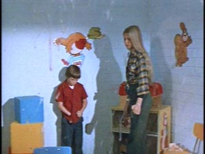Anyway, they are able to test this device on a TV interview just then being conducted with the Governor. "And so it is your contention then, Governor," the reporter asks, "that the threat of exposure by the Freedom School television station [I kid you not, this is really what the interview is about] will in no way find any wrongdoing or kickback of this federal money ever touching the state capital.*" (Man, those Yoga English classes are really catching on!) "As God is my witness," the Governor begins, and we tune out, because it’s well known that only hypocrites and liars mention God. Hey, where are those Doritos? [*It should be noted that the reporter in this case is actually supposed to be a professional broadcast journalist, yet he still says things like, "…that the threat of exposure by the Freedom school television station will in no way find any wrongdoing…" Huh?] Somehow this proves the lie detector works, and the kids debate how to use their awesome new power. "Think of what this machine would do to Advertising Industry," one young lady gushes. "It would just blow it apart." This is true. Imagine the exposés: "Hey! Her hands are not in fact soaking in it right now! Quick, call the others! We’re marching on the corporate offices of Ogilvy & Mather!!" Seconds later, of course, another student suggests that they "get the tapes of the Watergate hearings and run them through this thing, and we find out the Truth." Needless to say, all of the other kids are blown away by this totally far out idea. Of course, with the Freedom School now threatening the entire stranglehold of power of, er, The Man, or whatever, the government twists the screws some more. No, they don’t cancel the school’s grants, because, uhm, anyway. Instead, now FBI agents start harassing family members of kids attending the school. Hmm. Maybe the kids should do television stories on that, rather than exposing stores that repossess your furniture if you stop paying for it. During this period, of course, Billy was still in jail. No one ever visited him, as he couldn’t stand to have them see him "caged up like an animal." Meanwhile, Jean held her breath for the entire four years, "hoping he hadn’t given them an excuse to extend his sentence or even kill him." The reporter muses over this. "So you really didn’t think they’d let Billy out alive?" she queries. "No," Jean replies. "Not even if they had to shoot him when he was going through the gates on parole." As noted earlier, they not only don’t kill Billy, they shave 20% off of his ludicrously lax minimum jail term for good behavior. Those fascists!! Unfortunately, Jean couldn’t be there to pick him up when he was released. You see, this happened on the very day that the Freedom School was hosting "our first international seminar on child abuse." I’m sure Billy understood, though, because The Cause in all its myriad facets comes first. "The kids had [three guesses] done an exposé on child abuse, child battery, and how widespread it is here in this country," Jeans explains (and explains, and explains…). "Pretty soon," she continues, "we were recognized as one of the few places that could successfully help parents who battered their children." Cut to Jean, in a weird, Annie Hall-esque man’s suit, showing a couple of child abuse experts around their facilities. During this tour we meet Danny, a young lad of maybe ten, who is in many ways the film’s poster child. Danny is missing a hand, and they nicely present the (real life) stump of his arm in a nice, juicy close-up.