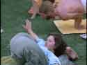 Soon the entire pack of kids are singing the chorus as Billy manfully struggles to contain his tears. Carol as well becomes increasingly verklempt as the song progresses, perhaps because she was now wishing she’d worked on it a little longer. In any way, there soon isn’t a dry eye in the place, and everyone can feel the love in the room, and we in the audience begin wondering when those promised government killers are going to show up. Billy is next led outside. There he is astonished to find pacifist Jean taking martial arts lessons from Master Han of Korea, this worthy being Laughlin’s real-life Hapkido instructor. (Watch for when Jean supposedly performs a leaping kick, and they apparently use an edit to disguise the fact that she doesn’t pull it off.) The end result of this, especially when Jean rather implausibly dumps Billy on his ass after he chortles at her, is apparently meant to represent ‘comedy.’ However, much like the Germans, the Laughlins prove the sort of markedly intense folks who don’t really get the whole ‘humor’ thing. Meanwhile, in a weird editing choice even for this movie, Jean’s Wacky, In-Your-Face-Aide (think a hippy-lesbian Sandra Bernhardt…er, a younger one) blows a line, then tries it again with more success, and both takes are kept in the film. Soon Billy is—surprise—talked into displaying his skills. He and Han do a couple of kicks, after which the latter produces an ordinary black cane. "I haven’t seen one of those in a long time," Billy avers. Huh? I mean, we’re not exactly talking the Flying Guillotine here. Anyway, Han uses the cane to help flip over his assistant. This accomplished, he hands the cane to Billy, who duplicates the feat. "You and I, in America, are the only ones I know who can do that," Han preens afterward. Actually, their demonstration isn’t all that impressive, although I’ll give Laughlin the benefit of the doubt and assume he didn’t want to pimp up his moves. Anyway, even pulled punches and kicks represent a vast improvement over more warbling folk singing.