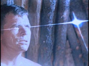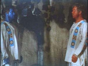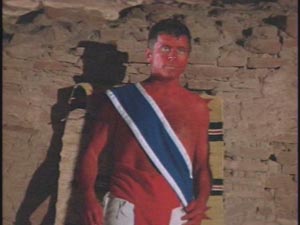 Finally, the students are told to return the next day, at which point we cut back to Billy’s ceremony. This is currently ensconced in a cave wherein a pair of flour-covered Indians are chanting and dancing around a fire. Some Elders, meanwhile, observe them from the sides. Then a curtain is shoved aside to reveal Billy, who enters shirtless and wearing a wide blue and white sash. Oh, yeah, and his entire upper body and head, except his hair, is covered with red paint. Then it’s back up to the mountain top, where