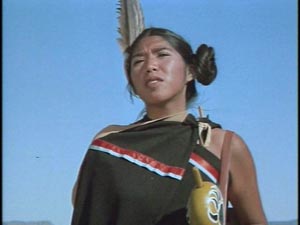We cut to Billy sitting (presumably) naked in a sweat lodge. "I see it, Grandfather," he says to the apparently empty chamber. ‘It’ is a blue-tinted flame with shooting white sparkles cartoonishly superimposed before his face. Basically, it looks like one of those energy beings that were always economically invading the Enterprise on the original Star Trek. Meanwhile, Billy conducts a (I guess) telepathic conversation with Grandfather. Oops, wait, Grandfather is sitting in the lodge opposite Billy. We didn’t see him because the film’s DVD presentation is atrociously pan ‘n scanned, radically cropped from a 2.35 : 1 aspect ratio to fit a square TV screen. This is weird, actually, because Laughlin himself released the Billy Jack DVDs. For some reason he used what I assume is a TV print to put on the DVD, rather than a theatrical print, which I can’t quite figure out. You’d think he’d want to preserve the integrity of the film more than anyone else, especially given the fact that he’s always bent over backwards to associate himself with Billy Jack. "What color is [the flame]?" Grandfather asks Our Hero, and is told it’s blue. "That is a spirit looking to see if you are worthy," he explains. "It takes many forms." Then the flame disappears. "Where did it go?" Billy inquires. "When you can tell me where the flame comes from," Grandfather replies, "I will tell you where it goes when it goes out." Seriously, this is just generic mumbo-jumbo, and could just as easily have come from Master Po as he instructed young Grasshopper. As with Grandfather, Billy is speaking in a native language, over which we hear an English translation. The latter consists of him speaking in short, declarative sentences, relayed in a slight sing-song fashion. This is presumably an attempt to convey the flavor of whatever tribal tongue he is speaking in (lines that he sounds like he learned phonetically), but the effect is to make him sound like a learning impaired person reading from a Curious George book. From this we cut to a panoramic helicopter shot traveling along some beautiful mesa country. Soon we see Billy and Grandfather standing upon a magnificent butte. I have to admit, shots like this always make me queasy, as I suffer from severe acrophobia. "Grandfather," Billy asks via voiceover, "where will I look for my shadow demon?" Again, he is told it emanates from inside himself, and that it represents "all the evil in you that others can see in you, but you cannot." This goes on at great length, and I mean great length, but remains similarly murky and abstract. Then we get this, after Billy asks how he can recognize his evil side. "By the things in others that make you angry," he is told. "Whenever you get upset at someone or something, it’s because that quality that you’re upset about really exists in you." Well, guess what, that’s not even insulting dime-store psychology, it’s outright bullshit. So if I become angry upon seeing a rapist, or a child killer, or some moron in the KKK, I’m angry because inside I secretly want to rape woman or murder children or wear a sheet and expose myself to be a massive retard? Sorry, I don’t think so. It’s quite a leap from "we all have an evil side" to that sort of statement. Blah blah blah, and on we go. Even to the extent that Grandfather’s spiel is valid, it amounts to little more than a restatement of Michael Jackson’s "Man in the Mirror." Don’t try to change others, change yourself. Now, that’s all well and good, unless those others are pounding in your head while they force themselves upon your wife. As a Christian, I obviously believe we have a lifelong obligation to attempt to discern and confront our own inherently sinful natures, but this is taking that idea to a rather unworkable extreme. There’s definitely internal evil, but there’s external evil, too, and that must be confronted as well. And, in fact, Laughlin/Billy Jack knows this, because otherwise he’d become a pacifist like Jean. That would be admirable, but even Gandhi admitted that non-violence wouldn’t have worked against the Nazis. Billy asks for permission to "descend into the Cave of the Dead." (Oh, bru-ther.) Grandfather tells him he must first find his own vision, by which I assume he means a spirit guide. Then we cut to Jean, apparently sometime later, as she rides up on a horse to ask an Indian guy about Billy’s progress. He has been fasting, she is told, and awaiting his vision. However, she must go no further. "If a woman enters these sacred grounds, the medicine is lost," she is told. Jean jokes with the guy about this, but then placidly turns around and leaves. I wonder if she’d react so complacently if a Catholic priest was explaining why the Bible doesn’t allow for women to be ordained. Billy is heavily sweating atop a butte, sitting on the edge and with his feet dangling over the side. (Again, this fair gives me the heebie-jeebies. I’ll give Laughlin this; he’s a far braver man than I.) Meanwhile, Grandfather sits a short distance away, watching over him. Suddenly, a woman’s voice is heard. It’s the Vision Maiden, as played by Trinidad Hopkins (!), for whom this appears to be her entire thespian career. "Come, Billy Jack. Come, for I am going to show you the true nature of the White Man through all of history*. Come and look with me over this river of time." [*Good thing this wasn’t a white spirit telling a white guy about Indians all through history, because that would be racist.] "There’s St. Augustine," the Spirit suggests sarcastically, "preaching the Christian creed of Love to the Druid mumble mumble [yeesh, you’d think a Spirit Voice could speak up a little], with the tips of their lances dripping with blood." Oooh, burn! Snap! Oh, no, you did-int! You go, Vision Maiden! Anyway, during this another panoramic helicopter shot reveals the Spirit to be a woman dressed in traditional Indian garb, including, yep, a tall fea