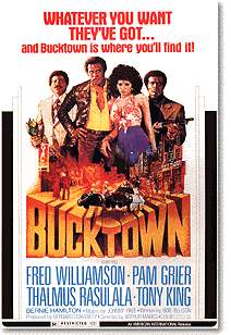 (1975) Plot: Fred "The Hammer" Williamson kicks some white ass. (Well, OK, that’s the plot of every Fred "The Hammer" Williamson movie.) Our setting is the Southern town of Buchanan, nicknamed Bucktown due to its largely black population. Getting a radio call, two redneck cops are soon chasing down a black thief. Catching the miscreant at the train station, they beat the man severely. Duke Johnson (Williamson), stepping off a train, sees this. He walks on, but has attracted the officers’ notice. Duke has come to Buchanan for the funeral of his brother Ben. At the service he meets Aretha (Pam Grier!), Ben’s girl. She’s hostile to him, knowing that he’ll leave town the first chance he gets. Which is true. In fact, Duke is angered to learn that he’ll have to wait two months before he can sell off the property he’s inherited from his brother. This includes a bar, which he decides to run until the waiting period is up. Soon the cops come around for payoffs, though. Duke beats two of them up and tosses them out on the street. Then he confronts Patterson, the Chief of Police (Art Lund). Patterson advises him to go along to get along. He also reveals that Ben was murdered, and hints that he had it done because Ben was causing trouble. Seething, Duke takes off. Aretha comes by to visit Duke at Ben’s old house, which he also got in the will. (If Aretha is going to be constantly pissed off, maybe she should save some of her ire for her ex-boyfriend. He could have left her something.) The two quickly fall into bed, allowing for Grier’s then de rigueur topless scene. After that, the cops appear out on the lawn and shoot the place up with shotguns. This is a warning, but naturally it only gets Duke’s back up. He is, after all, a Blaxploitation hero. He dismisses Aretha’s suggestion to leave town, explaining that he doesn’t run from anyone. He will need help. Calling up north, he reaches his old buddy Roy (Thalmus Rasulala). "It’s a jive town with a bunch of crackers," Duke explains. Roy quickly arrives with three other dudes to lend support, as witnessed by one of the cops. He’s naturally bewildered to see four large, nattily dressed (for the ‘70s) bru-thas getting off the train. How large? Let me put it this way: The smallest is played by Carl Weathers. The Blaxploitation film was not the most sentimental of genres, and Duke’s newly assembled crew is soon dishing out vengeance is an uncomfortably cruel manner. Watching the hulking Weathers, for instance, beating a runty coward to death with a baseball bat is pretty unpleasant. The other cops – a sum total of four officers – are taken out in short order. Patterson, meanwhile, is locked in the town jail while they try to get the location of his swag out of him. In most Blaxploitation pictures, this would mark the end of the movie. Here, though, we’ve still half the film left. Bucktown proves to have a lot more meat to it, putting it alongside such other complex genre entries as Detroit 9000. The town’s mayor, a black man who under Patterson’s regime was a figurehead, thanks Roy and his crew by making them the police department. Unfortunately, they quickly prove as corrupt as Patterson’s men were. (Many Blaxploitation films were loosely adapted remakes of old Westerns. This one is pretty similar to the Yul Brynner oater Invitation to a Gunfighter.) Ironically, the new officers look down on the town’s black citizens as much their redneck predecessors did. Not because of their race, but because they consider them hicks. Aretha is the first to figure out that the new state of affairs will pretty much resemble the old one. "Let me tell you something about people," she tells a scoffing Duke. "Whether they’re white, black, green, yellow or purple, when they smell a few dollars, they all act alike." And if anything, the new men are even more sadistic than Patterson’s crew. One of Duke’s friends is a garrulous old lush. Tiring of stories about his glory days as a school football star, Roy’s underlings set upon him with knives. This is more than a simple assault, however. It’s also a plan to drive a wedge between Roy and Duke, whose relationship the men resent. This is another way in which the new regime proves even worse than Patterson’s. The latter’s flunkies, as crooked and violent as they were, clearly recognized him as their boss. To an extent, Patterson made sure things didn’t get too out of hand. Roy, however, doesn’t have similar control over his men. (Worse, he thinks he does.) Patterson did keep a sort of brutally maintained civic peace, if only because Buchanan was their home. Roy and his men, conversely, obviously intend to squeeze the town dry and then take off. Avoiding the genre’s usual ‘black is good/white is bad’ mentality, Bucktown is a much more provocative film than most of its siblings. Which is why it remains relevant while many other Blaxploitation entries have simply become camp. Seldom, for example, does such a film foster sympathy for a character like Patterson. A scene where Roy’s men threaten him with a straight razor, however, is more than a little discomforting. Here evil isn’t solely a white man’s characteristic. In addition to its comparative moral and racial sophistication, Bucktown was made by pros. First, of course, there’s ex-pro football player Fred Williamson. The Hammer was perhaps the most handsome and talented lead actor to emerge from the heyday of the Blaxploitation film. He’s in full Clint Eastwood mode here, right down to his trademark panatelas. While Bucktown doesn’t provide him quite the showcase that Black Caesar did, this is still Williamson’s picture. Pam Grier presumably needs no introduction to anyone likely to be reading this. Her part here is somewhat generic, and certainly she’s not awarded the attention she got in her own starring roles. Still, there was seldom a film Grier appeared in that didn’t benefit from her prese