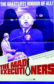 After everyone but Trooper and Hillier has left, we notice that one of the wax figures in the hall is clearly a guy in disguise. Given that Hillier walks right past him without noticing, he’s not exactly making up for the rope business. Hillier finally does discern his presence, while he’s returning the rope to its display area for the third time, but only because the fellow keeps moving his head around. Rather than being a villain, the guy proves to be Pennypicker, a reporter, would-be sleuth and self-proclaimed master of disguise. Hillier just takes him at his word and lets him go. It’s that kind of movie. Pennypicker will be the film’s comic relief character, but also, I couldn’t help noticing, does most of the actual detective work as well. That night Hillier and Trooper visit their old friend, Sir Francis Barry. Sir Francis is a retired judge, noted for being of the hanging variety. Hillier has long used him as a sounding board, and thus brought the ‘indictment" of the latest victim as provided by the executioners. (I’m not even going to go into how many rules Hillier keeps breaking with stuff like this.) Sir Francis pronounces the work more than sound, and notes that he himself would have given sentenced the man to death based on the evidence it provides. Also attending is Ann, Sir Francis’ buxom blond of a daughter. Buxom blondes being de rigueur in these things. Her character is a little hazy in construction. Here it seems like she’s at best a casual acquaintance of Hillier and Trooper, allowing for exposition on Hillier’s background. However, a couple of scenes from now, she and Hillier will act like they’ve been romantically involved for some time now. Whatever. In any case, Sir Francis also has an inordinately loyal butler, Jerome. Oh, and occasionally we cut to a vaguely seen figure lurking outside in the garden. The reason for all these characters, of course – Chief Inspector Smith, Trooper, Pennypicker, Sir Francis, Ann, Jerome -- is that at least one of them will prove to be an executioner. Even at this point, however, it’s pretty clear that Sir Francis will not be amongst the guilty. Currently, for example, he’s giving a lengthy speech on how namby-pamby the justice system has become. In other words, he’s such an obvious suspect as to almost certainly be a red herring. Even Hillier is meant to arouse our suspicions. It seems his beloved sister was brutally murdered a number of months earlier. Sir Francis brings the matter up in a hilariously nonchalant way, as if horribly slain relatives were common after-dinner conservation fodder. Ann is shocked to learn of the situation – see above note – and Hillier confirms that it’s so. "You might as well say it," Sir Francis prods. "It was a sexual crime." He apparently knows that the secret to an amusing anecdote is in the details. Anyway, she was killed by a serial murderer who so far has eluded arrest. "You tell her, Doctor," Sir Francis helpfully continues, turning to Trooper. "You examined the body of Inspector Hillier’s sister." Anything to avoid those awkward pauses in the conversation, I guess. Attempting to be more circumspect, Trooper explains that the body was found under a bush. Sir Francis, a natural raconteur, has more to add. "Yes, amongst the flowers," he notes. "Her head cut off." (!!) Yep, no host ever made his guests feel more at ease than Sir Francis Barry. I mean really, can you picture seeing this in a theater? I can only imagine the gales of laughter that would result from watching all this with an audience. Try to visualize the scene: The host, yakking on at gruesome length to his daughter about the horrible crime committed against the sister and friend, respectively, of his two guests. As for Hillier and Trooper’s restrained reaction to all this, well, they certainly have solid command of that British ‘stiff upper lip’ thing. Eventually we get to the point of all this, which again is to set up Hillier himself as a suspect. Sir Francis asks Hillier if he would derive a measure of satisfaction were the executioners to hang the man who murdered his sister. Hillier admits he would. Sir Francis also casually mentions that crime rates have plummeted since the executions began. This is interesting, since it prefigures the scenarios of such popular ‘70s vigilante movies as Death Wish made a decade or more later. Cutaways and blaring organ chords remind us of the guy lurking out in the garden. Sir Francis reenters the room after a brief absence, bearing a gift box. Suddenly, a voice from outside yells, "Watch out! Don’t open that box! Throw it outside!" Hillier quickly obeys, tossing it out the patio door. There follows (what else?) a huge explosion. As the dust clears, they see Pennypicker, dressed as a Bobby and covered with debris. Good thing he’s the comic relief, or he might have been killed. Pennypicker, we learn, had heard of a threat against Sir Francis. So he went undercover dressed like a Bobby (!) to get more details. (Why one would get info from the criminal set by dressing like a cop isn’t explained.) Word was that a crime boss, released from prison earlier that day, was planning to kill Sir Francis. Rather than just reporting this to the cops, he decided to lurk out in the bushes until something suspicious happened. He again offers his detecting services to Hillier, who again turns him down. Despite the fact, which seems somewhat relevant, that Pennypicker just saved all their lives. Sir Francis at least has the courtesy to thank him. "That was very considerate of you," he opines. Gee, Judge, don’t gush all over the guy. Soon the hangman’s rope is stolen again (!!), right under the noses of some card-playing cops guarding it. Hope you weren’t counting on that pension, boys. The hooded fugitives, meanwhile, escape in their horse-driven hearse. (!!) I don’t really want to go into too much more of this, since people might want to see it on their 