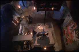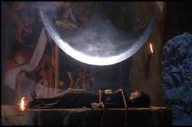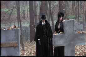 Hellsubus (extremely well played by Rocky Horror icon Richard O’Brien) is afflicted with the Hellsubus family curse. As a result, his senses are incredibly, painfully sharp. He’s also morose over the suicide of his beloved first wife, Elura. Who, it turns out, took her life exactly ten years ago tonight. And, amazingly, Elura’s portrait reveals her to have been a dead ringer for Elvira herself. Go figure. Hellsubus has a niece, Roxanna, herself a typically ailing example of the clan. Overly pale and given to bouts of tubercular coughing, Roxanna also naturally faints at the drop of a hat. For some reason, she also sports a heavy Romanian accent, as opposed to her Uncle’s silken British tones. Things go on from here, and continue to get deeper into the Corman vein as events proceeds. One gag that doesn’t reference a Corman, but which suits those film’s general time period, involves the mansion’s studly, Fabio-like groundskeeper. He proves to speak in the sort of overemphatic and ill-synced American accent familiar to fans of ‘60s Italian horror flicks, like Black Sunday, that had been dubbed into English. This remained probably my favorite running gag. The merging of this material with the crasser Elvira bawdiness works surprisingly well. Presumably the coarser material extends its welcome because it’s counter pointed by the subtler material. Aside from the boobie gags, however, there’re several funny scenes poking fun at broader genre conventions. The scenes where Our Heroine follows a mysterious figure to a nearby cemetery is a good example, and contains several funny bits. Petersen even gets a ribald, music hall-type song and dance number. As with the best parodies, Elvira’s Haunted Hills manages to assume many of the qualities of its models. For instance, the film is stunningly sumptuous, especially given what had to be an extremely modest budget. This certainly recalls the Corman Poes, which typically looked far more lavish than they actually were. And, as is often the case with the better horror movie parodies, there are also a few moments that are actually spooky. Tech credits are strong. The level of acting here is often flawless. Wisely, the actors generally mimic the over-ripeness of Price et al, rather than further exaggerating things to overtly farcical levels. Also, director Sam Irwin proves an able student of Corman’s directorial style. Also of note is a surprisingly well-made and thoroughly interesting ‘making of’ feature on the DVD. Lasting about twenty minutes, it provides a lot of interesting information. For instance, they actually wanted Fabio for the groundskeeper, but he was unavailable. (Which is a pretty funny thought right there. Perhaps he was shooting A Time for Romance II.) So they got Gabi Andronache, the "Romanian Fabio," instead. As he couldn’t speak English, they decided to dub him like a character from an "Italian Hercules movie". As noted above, this was my favorite gag in the picture, and a good example of how to turn a problem into an advantage. We also learn of the advantages and disadvantages of shooting in Romania. The cast is shown complaining about the food, and creature comforts were obviously hard to come by. However, the economic benefits of filming there are obvious. We watch as the simply gigantic castle sets are fabricated, and look upon the Russian Symphony Orchestra as they perform the film’s score.