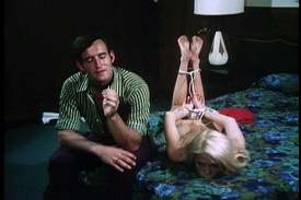 In any case, the scene is meant to portray what a masterful crime lord Rex is. Instead, it functions as a brilliant seminar on how to block and shoot a scene in the most awkward fashion possible. You can practically see the ‘X’s on the floor to which the actors woodenly stride to hit their marks. Once ensconced upon them, they visibly wait while the cameraman pauses three or four seconds too long before zooming in on them. Cut to a darkened room, as we watch a leather-clad cat burglar getting something out of somewhere. I think. Even on DVD this sequence is murky enough that you can hardly make anything out. Despite the valiant effects of some incessant staccato music to suggest that the scene is exciting, this all remains quite dull. In the end, the burglar removes a mask to reveal *gasp* Ginger. Wow. Next we go to the bar where Rex and his minions hang out. They watch a girl doing the Frug. Being the crime boss of Brighton, NJ is even more glamorous than I could have possibly imagined. Ginger enters, wearing her first really, truly atrocious outfit. (The fact that I’m not so accounting her first set of attire reveals just how stringent I’m being.) It’s a purple, er, well, there’s really tight slacks and a matching midriff bearing, long-sleeved top that covers from the bottom of her breasts up, accessorized by a purple paisley scarf and white boots. She orders a martini, presumably because that’s what spies drink. The girl doing the Frug is one of Rex’s stable. She’s engaged in some contest thing that involves a nerd standing against a post. She rubs up against him until…uh, something happens. Anyway, the woman loses. Anyone who’s seen a Ginger movie will immediately ken that Our Heroine will take her place and ‘win’ the contest. This hasn’t happened yet, but…yep, there we go. Ginger moves to the designated spot and points to Rodney. He assumes the pole position. (No, not that pole position. What are you, twelve?) She rubs her ass and crotch on him as she dances, and we realize that Paul Verhoeven must have seen this movie as a kid. Hey, how about a new series of Ginger McAllister movies starring Elizabeth Berkley? You know, I could actually see that. Ginger and Rodney are next seen strolling along the Brighton carnival boardwalk. We’re still early in the film, so this doesn’t really go anywhere; it’s just ‘character’ stuff. By the way, watch how awkwardly Caffaro walks here. She obviously has to go at a slow set pace so the camera dolly can match the couple’s perambulations, and she can’t manage a realistic gait. Next we cut to the beach, whereupon we witness an archetypical Ginger McAllister movie sequence. Our Heroine is lying on a blanket, clad in a teeny-weeny blue bikini. She soaks up the rays, apparently to ensure her skin maintains at least a seven on the Moh’s Hardness Scale. Or perhaps, given her all-too visible tan lines, she fell asleep and suffered some sort of horrible varnishing accident. In any case, she soon finds herself surrounded by Rex’s femmes, here to chase off the new competition. Ginger, of course, isn’t going to take this lying down. (Well, actually, she takes most everything lying down, if you know what I mean.) She and the gang’s toughest moll, Vicki, exchange some of the most stiltedly executed invective in movie history. It’s like watching a put-down contest between Al Gore and an Ent. During this, Ginger charmingly uses the term ‘jungle bunny’ in reference to Jimmy, the gang’s black dude. And Ginger, let’s remember, is our heroine. Ah, the ‘70s. Something to offend everyone. Ginger challenges Vicki to a match, womano-a-womano. Whoever first cries uncle will be adjudged the loser. Vicki’s response pretty much distills the McAllister movies down to their essence: "You don’t get off that easy! Loser has to be stripped and then say she quits!" And so they begin. To our general lack of surprise, the two women prove as woodenly inept in tussling physically as they were verbally. Eventually, though, Ginger gets Vicki’s bikini off and ties the woman up with it. Take that, Bettie Page! One of the other girls, Cathy, is secretly pleased by Cathy’s humiliation. When I say ‘secretly,’ I mean she smiles widely right in front of the others, but only we in the audience are suppose to see her doing so. In the next scene, she’s in Ginger’s hotel room, spitting out a massive unprocessed cud of *blech* Characterization. "I was just a secretary," she begins. "I wasn’t looking for any far-out, wild excitement. All I wanted to do was fall in love with some guy, have him marry me and make a home for me and have children." You know, that sort of thing. Instead, she fell in with Rex’s bunch. Now she’s a whore—actually, "a rotten, lousy, two-bit whore!"—and there’s no way out, blah blah. In fact, she’s even starting to *gasp* hate men. This dreadfully delivered soliloquy goes on at some length and ain’t helping things much. In the end, though, this too passes. Responding to Cathy’s pleas for help, Ginger offers her the, uh, Balm of Sappho. Apparently that’s just the ticket when one feels sexually degraded by men. During this, Ginger squeezes Cathy for information. (Among other things.) The, er, balming is portrayed at some length, as you may have suspected. On the other hand, we’re not talking one of those Seduction Cinema flicks or anything. If that’s your bag, you should probably stick with whatever film Misty Mundae is putting out this week. After that wraps up, Cathy’s heart is lightened. Ginger asks her to testify against her cohorts once they’ve been safely locked up. Cathy agrees. First, however, she seeks reassurance that their, eh, interlude doesn’t mean that while she’s in fact here, she’s necessarily queer. Ginger comforts her on that, uhm, score. "Cathy, you’re a normal, healthy young woman," she asserts. She then suggests Cathy remain in hiding. Cathy, ho