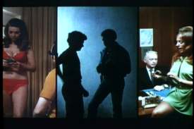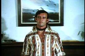 before moving towards it. A narrator fills us in: The oration continues as Ginger roams the building’s hallways, rides an elevator and roams more hallways. It’s like an extended version of the Get Smart opening credits. After minutes spent watching a car tool down the road and then viewing Our Heroine make her laborious way through a maze-like office building, it’s obvious already how ‘Ginger McAllister’ became a synonym for blistering action. One thing that immediately registers about actress Cheri Caffaro, especially given the circumstances, is that she really isn’t all that hot. Not that she’s unattractive in any sense either. Many, no doubt, would find her long blonde hair and slender, lithe body striking. However, some looks come and go, and Caffaro’s super-deep tan thing has definitely lost favor. Although only 26 when Ginger came out, Ms. Caffaro’s already leathery-looking skin makes her look much older than the script-indicated 23. I’d have guessed she was in her early thirties, myself. And given the venerable tradition of actresses lying about their age, she might well have been so. In sum, she looks a lot like fellow period sexbomb Regina Carroll (Al Adamson’s wife), minus the phony giant boobs. So at least she has that in her favor. Given this, one might wonder how Ms. Caffaro landed the headlining role of Ginger McAllister. It presumably wasn’t on account of her thespian skills, for her acting in this picture could best be described as robotic. Nor does she come across as particularly graceful or athletic, although perhaps she’s just awkward on camera. Obviously one must seek elsewhere for the answer. You might posit that even in the let-it-all-hang-out ‘70s, few actresses would have been willing to go to the seamy extremes the series required. The less chivalrous, meanwhile, might suggest Ms. Caffaro was cast because her husband, Don Schain, wrote and directed the movie. By the way, what’s with all these guys—Schain, John Derek, Al Adamson, et al.—who were constantly directing their wives in these squalid sex movies? What’s up with that? Ginger eventually enters an office where two men are waiting. It’s not really spelled out, but I’m guessing it’s the headquarters of a private investigation firm. Brad is the helmet-haired, straight-laced underling. Jason is the Boss Who Only Cares About The Job, No Matter What The Cost. He fills Ginger in on a crime ring operating out of Brighton, New Jersey. (!!) Yep, no locale promises exotic dangers like Brighton, New Jersey. Take that, Casablanca! The ring caters to various illegal appetites of the wealthy tourists who fill the area three months a year. The chief bad guy is a "tough kid" named Rex Halsey. His crew is comprised of seven underlings, four women and three males. Rodney is the jaded son of a socially prominent family. Jimmy is the tough black guy motivated by his hunger for white ass. (Welcome to the Ginger McAllister series.) He is, of course, the gang’s streetwise drug dealer. D.J. is, uh, the other guy. Of the women, Vicki is the tough one, Liz the bored socialite-analog to Rodney, Jean the hot number and Cathy the one who doesn’t really want to be here. The ladies comprise Rex’s stable of hookers. Ginger is provided with a file on the gang’s activities. "There’s enough sex in there," Jason observes, "to give Kinsey and Masters & Johnson a run for their money!" He explains that the police know what’s going on, but aren’t about to do anything about it. I’d believe this were Halsey just providing illicit services and drugs to the rich. Vacation towns aren’t about to go around busting those who keep the tourists happy, as long as a little discretion is employed. However, the gang also seems to kill quite a few people in attention-drawing fashion. That I can’t believe they’d get away with. Nor has the private sector been much more effective. Two other agencies have tried to break up the gang, resulting in a number of brutally slain operatives. One such, a female, had been gang-raped first. Again, viewers looking for charm should probably skip this particular series of films. In any case, with undercover agents habitually trying to infiltrate the gang, you’d expect them to be on their guard. Ginger, we eventually learn, has come to Jason seeking a dangerous assignment. The implication being that she’s a thrill-seeker who only feels alive, blah blah. Just to prove she’s no chump, though, she wheedles an offer of fifty grand, half the agency’s total fee, should she break the case. Admittedly, fifty grand was a wad of cash back in ’71. However, since Ginger presumably got half of her "wealthy" parents’ money after they died, this again can’t be her real motivation. Nor so with Rodney or Liz, who quite evidently are meant to be Ginger’s darker doppelgangers. This ‘theme’ is sort of put out there, although they don’t really do much with it. Ginger is provided with a rather low-rent edition of the obligatory Briefcase O’ Spy Gadgets: Handcuffs, revolver, mini-tape recorder, pocket camera, etc. She takes off and we get our most ‘70s moment yet, a multiple split-screen portraying various activities of the Halsey gang: Drugs, prostitution, blackmail, etc. Then we cut to Halsey holding a board meeting. He looks so horrifying that I won’t even try to describe him. Well, OK, I will. Think of a young, tanned, greasy, just-starting-to-bald Andy Kaufman wearing one of the world’s worst ‘70s shirts, accessorized with a leather choker. Sadly, however, the dude playing Rex evinces none of Kaufman’s subtlety as an actor. In fact, his method appears to a careful merging of the thespic techniques of Paul Lynde and Fred Gwynn. All in all, he’s just slightly more flamboyant than Tim Curry in The Rocky Horror Picture Show. Plus he wears more mascara. Anyway…yikes!! Sorry, the camera just pulled back to reveal the guy’s brown corduroy button-fly tro