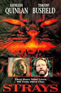 Plot: Night of the Living Dead, only with housecats instead of zombies. For whatever reason, the killer cat genre remains a surprisingly robust one. I mean, I can understand movies being centered on killer dogs, because dogs could actually, you know, kill you. In contrast, killer cat movies—by which I mean films featuring regular-sized domestic cats—generally require a fair amount of cheating in this area. Still, such films continue to be cranked out on occasion, as Mr. Peeve can attest. I suppose it comes down to the fact that many perceive your standard pet cat, sitting slit-eyed and inert in a shaft of sunlight like some exhausted and particularly self-satisfied tribble, to quite likely be thinking secretive and no doubt wily thoughts. My own take on the matter is that cats are stupid, certainly stupider than dogs. I realize this contention will occasion a certain amount of controversy, but I stand by it. I also realize that cat fanciers will likely make a diametrically opposed assertion. However, in my experience their evidence usually comes down to the fact that cats, unlike their canine peers, will not perform tricks. This, I have oft been informed, proves them to be possessed of such a fierce intellect and dignity that they disdainfully refuse to humiliate themselves for the pleasure of us mere homo sapiens. Of course, one could make the same argument regarding, say, spiders, or bottles of aspirin. Please note, I am not contending that cats can’t or don’t make good pets. People with dominant personalities have dogs to amuse them and actually interact with, and folks with submissive ones have cats to tacitly boss them around. I don’t really see any problem with that arrangement. I just find protestations of feline superiority to be somewhat, er, non-empirical in nature. Strays was a television movie made for the USA Cable Network. (I guess I could really just end the review right there). Basically, it’s generally competent in its execution, sports a limited budget—the end credits cite a whopping eight characters, including Phone Man, Old Woman and Policeman—but not extravagantly so. In the end, it proves more uninspired than outright farcically inept. It does have its mirth-inspiring moments, however, and most of these revolve around attempts to make a horde of cats into an adequately believable menace. The picture opens in a striking, innovative fashion, with a full moon filling the screen and being occasionally obscured as clouds drift past in spooooky slow motion. Now all we need is a torrential rainstorm punctuated by strokes of lightning to really create a truly original effect. More daring still, we cut to some dank and dark interior space. Quite a lot of water drips from the ceiling, and the only illumination is provided by—are you ready?—a diffused yet surprisingly bright shaft of light filtering past—yes!—the slowly rotating blades of an industrial-sized fan. It turns out that it is raining outside (bravo, auteur!), and that the dripping water is saturating the attic of a house out in the country. Meanwhile, we hear a cat growling and see elliptical flashes of fur and such. Outside, we cut to a laughably cliché employment of the ground level ‘shaky-cam’ director Sam Raimi invented to indicate rapidly moving demonic forces in the Evil Dead movies. This moves entirely too fast to indicate a cat’s POV, not to mention that the distance from the ground keeps changing, but there you go. The camera proceeds through a cat door leading into the aforementioned house’s kitchen. There are a few impressive moments when the camera glides through some especially tight spaces, but really, this sort of shot is such a signature of Raimi’s work that using it only calls attention to the fact that you’re watching a movie. In the living room, we meet an elderly female (no doubt the ‘Old Woman’ mentioned in the closing credits) who we quickly learn is one of those half-crazy cat ladies. She wakens and makes to feed her small army of cats, only to find her refrigerator bereft of kitty chow. This necessitates a trip down to the cellar—uh oh—which inconveniently requires one to leave the house and use an exterior set of storm doors. As the Old Woman pulls the doors open, there’s an Ominous POV shot from some bushes, accompanied by an Ominous Music Cue. All in all, the effect is quite, er, ominous. The Old Woman tries the light in the cellar, which naturally doesn’t work. (Are the cats supposedly behind that?! And if they’re supposed to be, wouldn’t the smart play have been to have the light bulb smashed, rather than just not functioning?) She proceeds on, grabbing one or perhaps two cans of cat food from the shelves. First, is she going to make this inconvenient trip to the cellar every time she needs to feed her cats? You’d think you’d bring up an armload while you were down there. Second, no wonder her pets turn murderously mutinous. (Oops, sorry.) She’s got like fifteen or twenty of them and she’s feeding them all from one small tin? Back outside, and I don’t want to shock the hell out of you, but the Old Woman is suddenly attacked by a malicious POV shot. Since this moves in at a level chest-high to a human (!), it would in no way suggest being that of a cat were we not aware of the film’s premise. Screaming, the Old Woman ducks into the cellar, followed by the POV shot. Here we cut away, since it would be sort of difficult to stage a single housecat killing even a very old woman indeed. Moreover, this is clearly going to be the sort of movie where several people will die horrible, violent deaths without any of the central characters being the wiser. Therefore, having the Old Woman flee into the isolated storm cellar under her own power is about the best they could do to mitigate the situation’s essential goofiness. We cut to the car of the Jarretts, wife Lindsey (Kathleen Quinlan!), husband Paul (Timothy Busfield) and young Tes