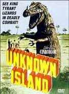 What I loved was that we see the sloth twice after this. Once it horribly slays somebody, later it fights one of the film’s less-than-awesome T-Rexes. (Hmm, you know, if it were an ape rather than a sloth…) The thing that killed me was that in its first two appearances we never got any impression that it was more than gorilla-sized. However, in the last scene it strolls into shot and we see that it’s nearly as big as the T-Rex, so it must be like fifteen feet tall or so. I thought this was hilarious as, again, there had been no previous clue to its mammoth size. For instance, when it approaches the camp in its first scene, they fail to film it from a low angle to suggest size. Also, the sweating actors, watching the beast approach, are staring straight forward rather than looking up into the air. I wonder if the director even told them that the beastie was supposed to be a giant, or if they only learned this when they saw the completed film. Unknown Island is available on DVD, one bereft of extras, even so much as a trailer. Even so, it’s definitely worth a look. The picture and sound quality are pretty good for a fifty year-old cheapie. Summation: A must see for dinosaur and adventure movie fans. -by Ken Begg |