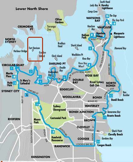 But then, I knew you would!" What – are – cozzies…. Well, I’ll tell you what, April: I’ll give you a hint. That isn’t a reference to the fact that you’re in the Southern Hemisphere. Now, think real hard…. (Tell me, oh gentle readers: are Americans really as incapable of figuring out mild slang as they’re always made out to be?) An announcer then welcomes everyone to the "PAUL MITCHELL Sydney Challenge!" and introduces "Team Baywatch, USA!" and "Team Sydney, Australia!" "This is a stage-race! Paddles, runs – with a little surprise! Then – more of the same!" (They really didn’t think this thing through, did they…?) A gun is fired, and to the cheers and flag-waving of those unfortunate extras, the PAUL MITCHELL Sydney Challenge is underway! And before many seconds have passed, we see why Team Sydney, Australia, took a blanket decision to cheat: they can barely figure out how to get their paddles into the water, let alone use them in a co-ordinated fashion. It’s going to be a long race…. (One amusing shot shows the kayakers crossing in front of the Bridge from left to right – a glance at the accompanying map of the harbour should tell you what’s wrong with that.) We cut briefly to Avalon, and Jake discovering that the sensible Terence has run away; and then it’s back to the race. Out on the water, the tactics of the Evil Australians are paying off, as Mitch and Alex continue to squabble instead of concentrating on their paddling. Over in the next kayak, Kip congratulates Nicki on the success of their dastardly scheme. Mwoo-ha-ha! Nicki, however, feels pangs of guilt at pulling such a dirty trick on The Mighty Hoff. But finally, she and Kip agree on their next move: "Let’s hammer them, then lay on the commiserating!" Mwoo-ha-ha-ha!! And then The Inevitable happens. As their kayak glides past some mesh fencing, April inquires innocently, "Hey, what are those fences for?" "Sharks," replies Cody. Surprise! "Sharks!!" exclaims April. Having gotten that Contractual Obligation out of the way, the two begin to review their previous evening’s activities, with April hoping that Cody didn’t wear himself out, snigger, snigger! (Actually, this whole sequence is funny for reasons that would be totally lost on non-locals. So far, the main thing that the two "Down Under" specials I’ve examined have in common is their insistence that women in Australia will take their clothes off at the slightest provocation; JAG even managed to work in an entire plot-thread based on this point; while both shows expended considerable energy on getting as many not-quite-nekkid people in front of their cameras as possible. At the same time, they both shied well away from the reality of the local situation. For instance, had the cameras trained on April and Cody swung to the left at this point, the Baywatch producers might have really had a ratings winner on their hands; because, unless my memory is playing tricks on me, the particular stretch of shark-netting we’re looking at is up near Lady Jane Beach aka Lady Bay – a genuine nudist beach!) Meanwhile, Kendra and Duggo are agreeing on how much they like the accents of their American rivals – "Very sexy!" – while Kip is still doing what he’s been doing since the start of the race: shouting "Left! Right! Left! Right!" at supposed triathlon champion, Nicki. (I think a big ‘L’ and ‘R’ on her hands might have been more useful.) These individual incidents have all taken place with the four kayaks quite some distance from each other, but suddenly, they’re all in a cluster and heading for the beach. The four pairs make it onto shore, at what appears to be Bradley’s Head, to the south of Taronga Zoo. With endless shrieks of "Go! Go! Go! Go!" they change shoes, grab a drink, and inspect the maps provided, then sprint off to the applause of still more embarrassed extras.